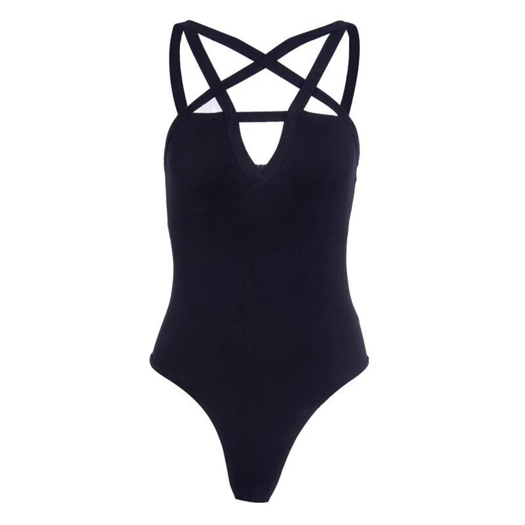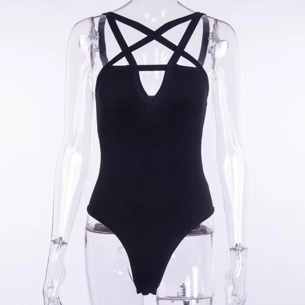В готическом стиле с низким вырезом, Для женщин комбинезоны Узкие однотонные низкая грудь сплошной Цвет пентаграмма вырез сексуальное боди комбинезоны для девочек в белую de fiesta 2020 Новинка; Лидер продаж E