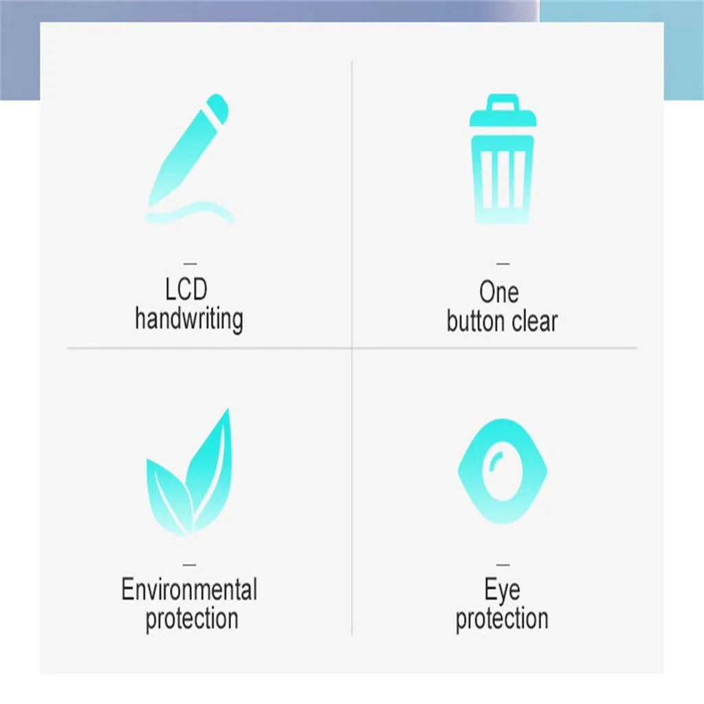 100% новый и высокий Качество. Новая форма, плотная и простая, новая матовая на ощупь, Минималистичная Рамка, ручка может использоваться в качестве кронштейна, а задняя сторона имеет магнитную наклейку Для легкая установка. Основные характеристики продукта: ЖК-дисплей Написание, частичное удаление, анти-шок, безопасность и охрана окружающей среды. Добавить функцию smart lock: После написания содержимого, есть функция блокировки под продуктом, не Беспокойтесь об удалении содержимого по ошибке! Материал: Гибкая жидко Кристальная пленка, корпус из абс + поликарбоната Писать способ: давления Зондирования Режим стирания: один клик Стереть 、 частичное исключение Пленка цвет: черный Тип батареи: кнопочный аккумулятор Срок службы: 5-10 лет Срок службы: 6-12 месяцев Нет пыли и цвета, нет Загрязнение окружающей среды Держитесь подальше от радиации, скажите До свидания с мобильными телефонами и планшетами Легко рассчитать арифметику, И читать слова Экономьте бумагу и пишите больше По сравнению с 100000 разПримечание: