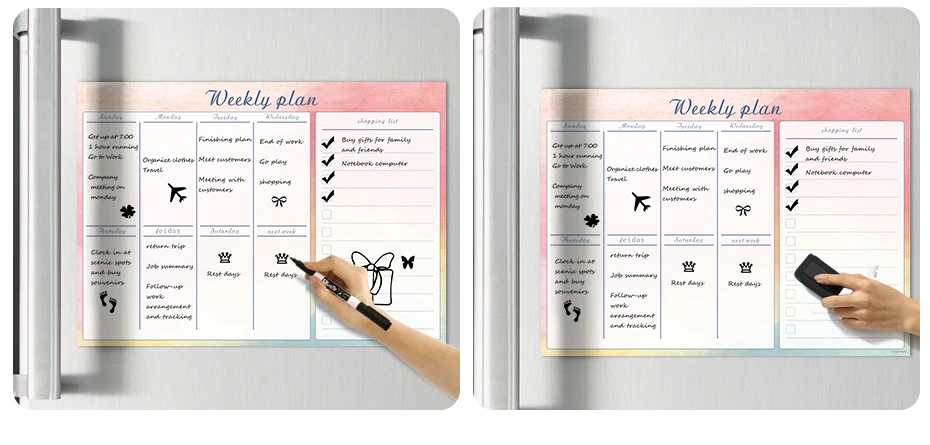 1. Запись школы, встреч, рождественских вечеринок, свиданий или секретных подарков Санты и подарков на праздники. 2. Отлично подходит для офисов, комнат в общежитии и фитнес-целей и делает Потрясающий подарок для планировщика в вашей жизни. 3. Это помогает родителям запоминать их важные встречи и деятельность их ребенка, в то время как это напомнит детям выполнять свои порученные задачи. 4. Холодильник может быть напоминанием, записью списка покупок и еженедельным планом. 5. Дети могут практиковаться в написании, граффити и рисовании.