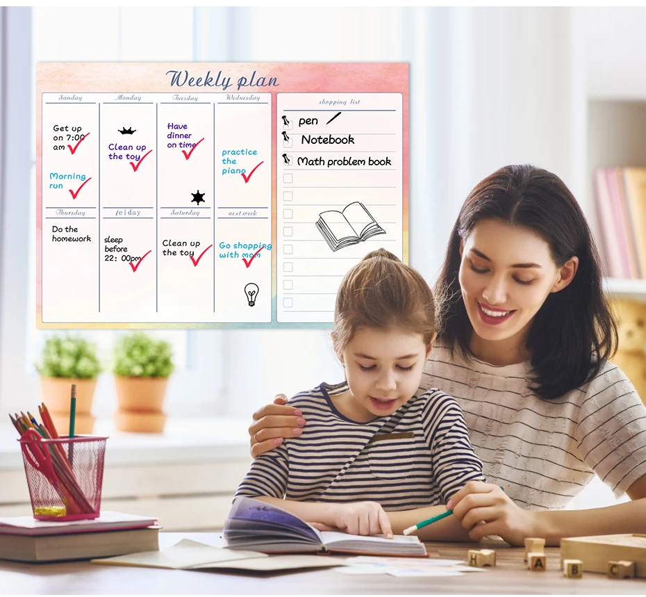 Описание: детские chore chart, магнитное расписание, to-do list Материал: магнитный порошок, резина, HD печать, ПЭТ пленка. Особенности: самомагнитный, гибкий, поддержка письма, портативный, прочный. Размер: 42*30 см Толщина: 0,4 мм Стираемость: сухая стирается, долговечная яркая и легко очищается. Применение: нанесите на поверхность из железа, например, на холодильник и так далее.