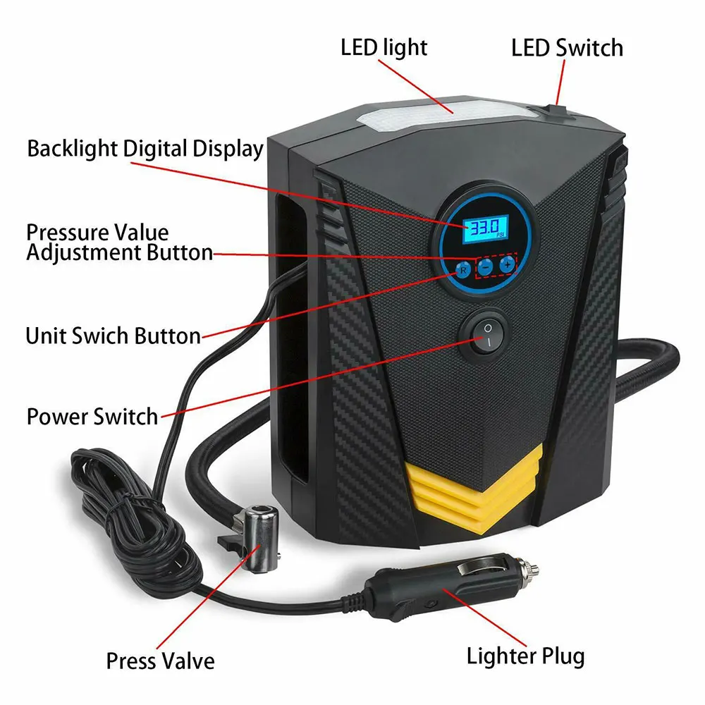 * 2019 новый модернизированный цифровой шинный инфлятор, 4 важных обновления. Более мощный, более прочный, быстрый и меньший уровень шума. * Это делает надувание низких и плоских шин в аварийной ситуации проще и удобнее. Манометр дисплей блока воздушного компрессора: PSI, бар, кПа, кгс/см2. * До 3 метров 12 В автомобильного шнура питания, может эффективно обеспечить работу радиуса продукта, нажмите кнопку, чтобы немедленно зарядить без затяжки. * Встроенный разъем для хранения кабеля и разъем для хранения шлангов, не нужно беспокоиться, что шнур слишком длинный, чтобы положить, более удобный в использовании. * Со встроенным светодиодный светильник, вам не составит труда увидеть, что вы делаете со своей шиной, даже когда вы работаете в темном гараже, припаркованном под сломанный уличный светильник, или сломается рядом с неосвещенной сельской дорогой. * Отлично подходит для многих типов шин: автомобилей, велосипедов, мотоциклов, RV, SUV, ATV, резиновых кораблей, а также спортивного оборудования и надувных изделий. Три дополнительных насадки и адаптеры, которые входят в комплект, делают компрессор универсальным и более широко используемым.