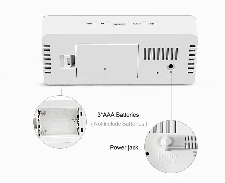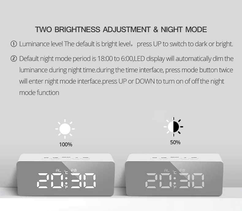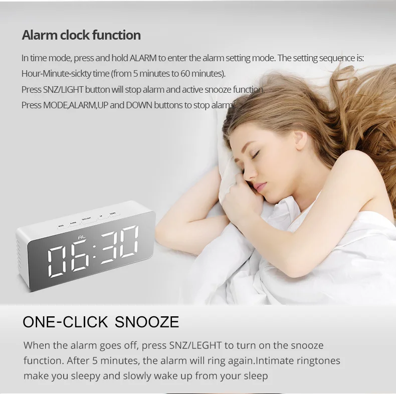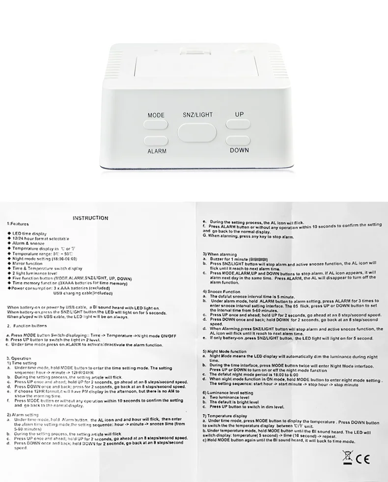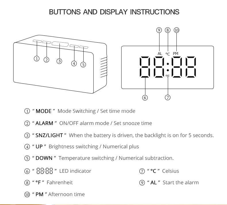 5. Простая установка: с пятью функциональными кнопками (режим, будильник, Snz светильник, вверх, вниз). Нажмите и удерживайте кнопки для установки.