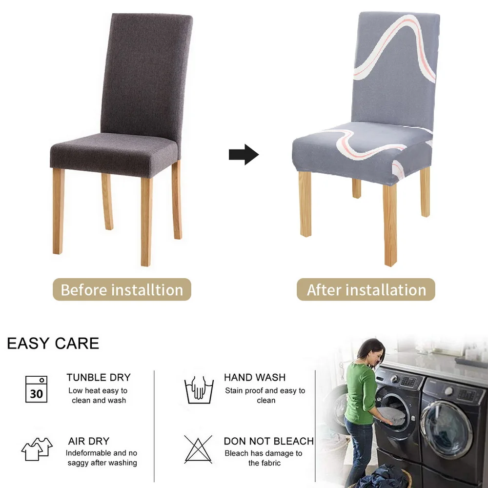 Простота установки: легко накрыть стул благодаря высокой резинке на 360 градусов.