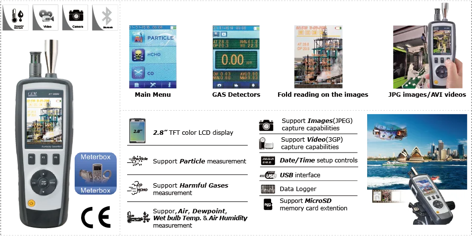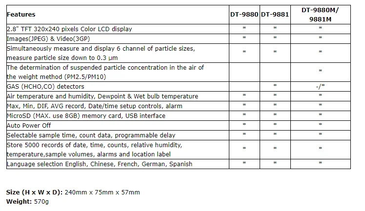 DT-9880/9881/9880M/9881M-счетчик частиц с 2,8 "цветным TFT ЖК-дисплеем и картой памяти microSD для захвата изображений (JPEG) или видео (3GP) для просмотра на вашем ПК, обеспечивая быстрые, легкие и точные показания счетчика частиц, детекторов газа (HCHO,CO), температуры воздуха и относительной влажности. Это первое сочетание этих измерений в мире, будет лучшим инструментом для защиты окружающей среды и энергосбережения. Измерение температуры точки росы будет очень заметным для влажной и сухой защиты. Это хорошая рука для промышленных измерений и анализа данных, реальная сцена и время могут отображаться на цветном TFT LCD. Любые показания памяти можно записывать на SD-карту. Пользователь может быть снова в офисе для анализа измеренного качества воздуха под поддержкой программного обеспечения.