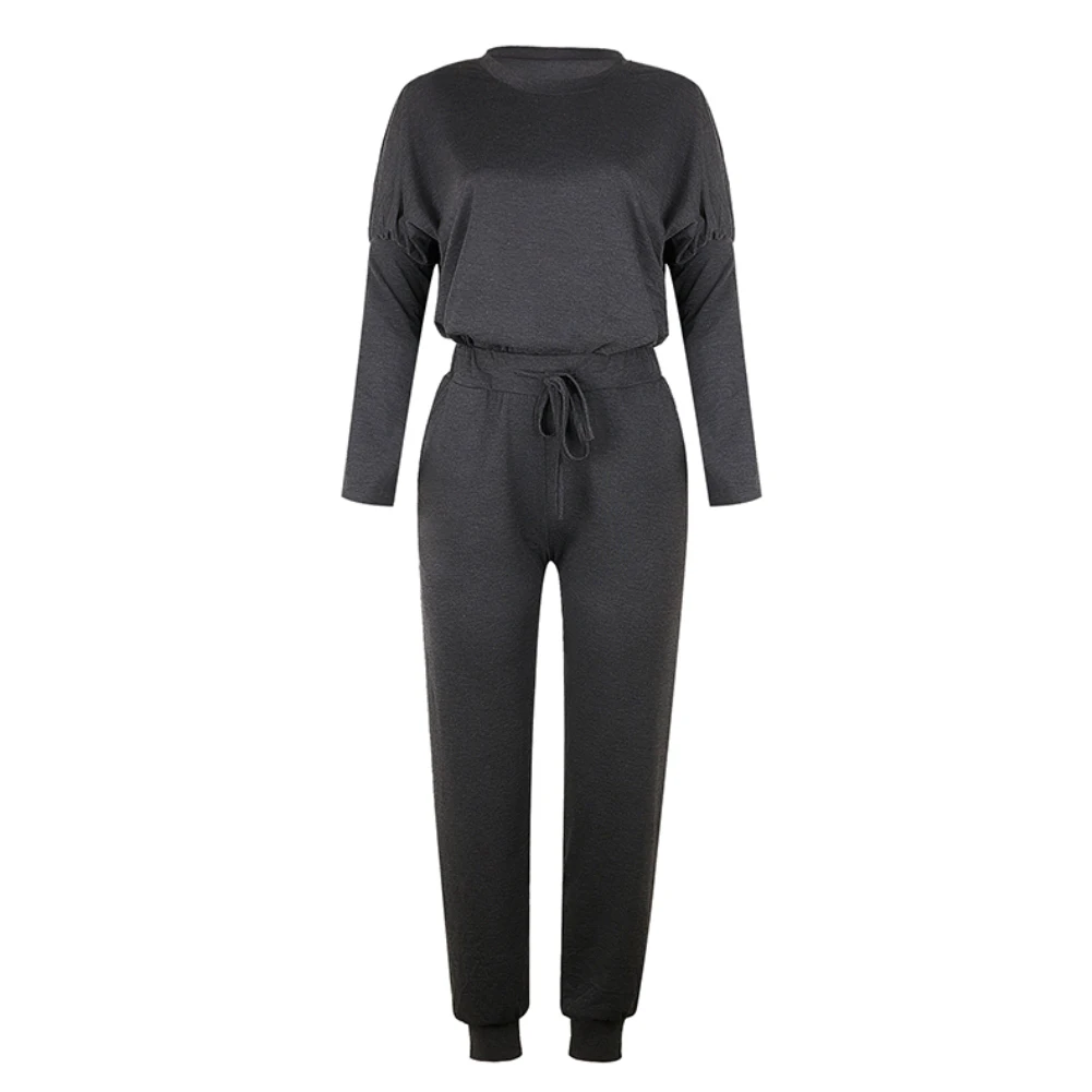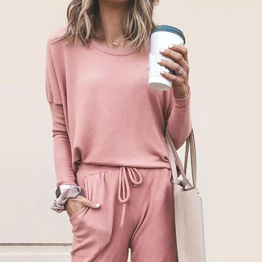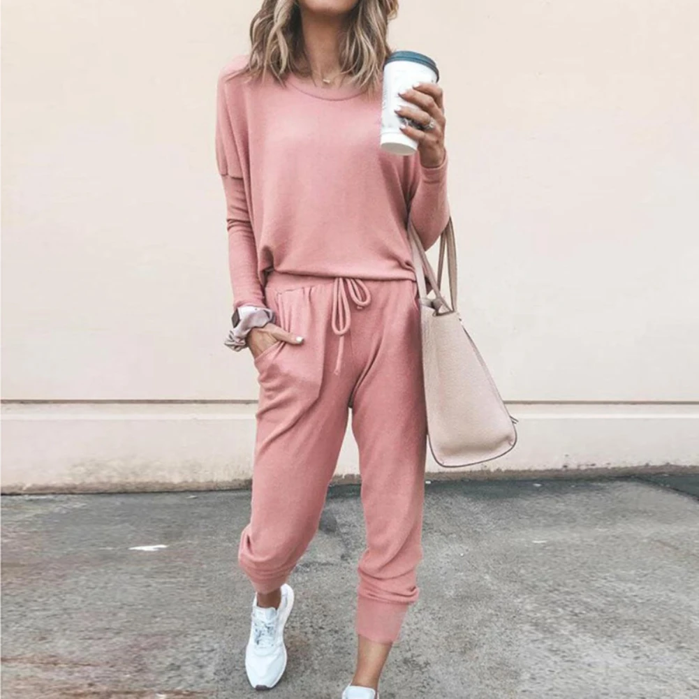 Женский спортивный костюм, Однотонная рубашка с круглым вырезом и длинным рукавом, брюки на завязках, 2 шт.