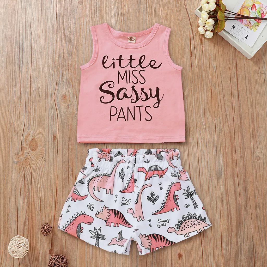 Жилет без рукавов с надписью для маленьких девочек топы + шорты с рисунком динозавра