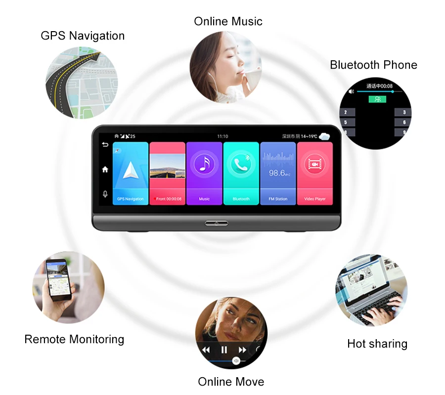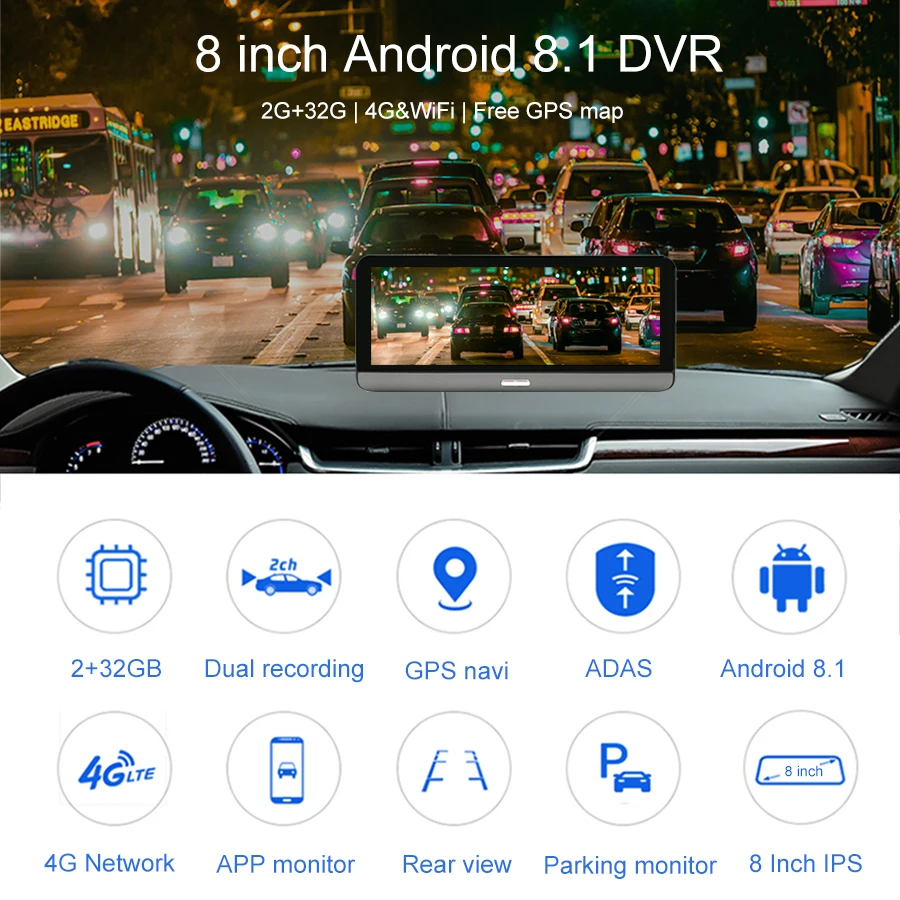 GPS навигация, Автомобильный видеорегистратор, монитор парковки, Bluetooth hands-free, WiFi, fm-передатчик, смарт-устройство с ОС Android 8,1, ADAS,4G интернет-серфинга, удаленный монитор, g-сенсор.