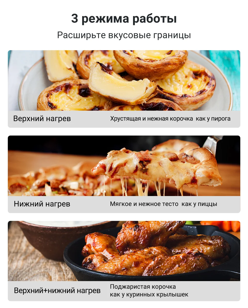Бренд Simfer Ширина, см 52 Глубина, см 44 Высота, см 33 Материал поверхности Металл Материал решетки хромированная сталь Комплектация стандартный противень, круглый глубокий противень, хромированная решетка, инструкция, гарантийный талон. Цвет Белый Вес, кг 10.8 Управление Механическое Система автоотключения Да Наличие таймера Да Тип таймера механический Количество режимов работы 3 Электрический термостат Да Количество стёкол дверцы 1 Направляющие рельефные Объем духовки, л 42 Дверца стекло Тип духовки Электрическая Подсветка Нет Переключатели поворотные Звуковой сигнал отключения Да Страна производства Турция Максимальная потребляемая мощность 1300 Размер противня (стандартный), см 3х39.5х34 Размер круглого противеня, см диаметр 37, высота 4.5 Количество противеней 2 Ручной таймер Да Размер упаковки (ВхШхГ), см 44/52/33 Гарантия производителя, лет 5 Режимы приготовления Верхний нагрев / Верхний+нижний нагрев / Нижний нагрев