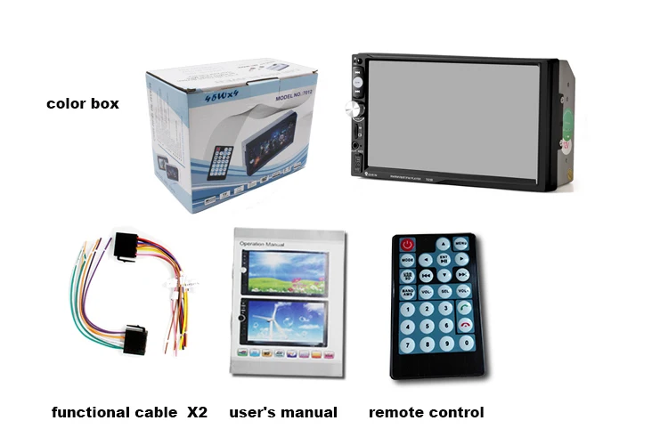 1 х Автомобильный MP5-плеер 1 X пульт дистанционного управления (без аккумулятора) 1 X Руководство пользователя Задняя камера (опционально)-1 шт.