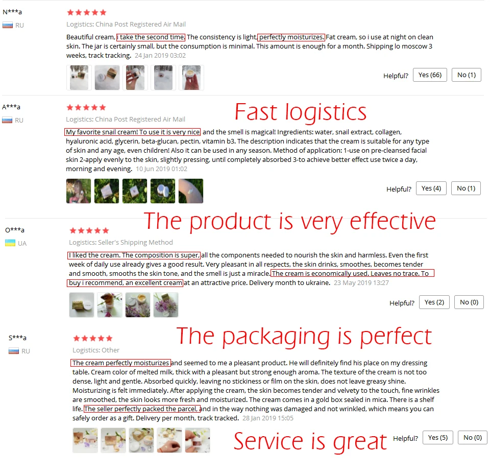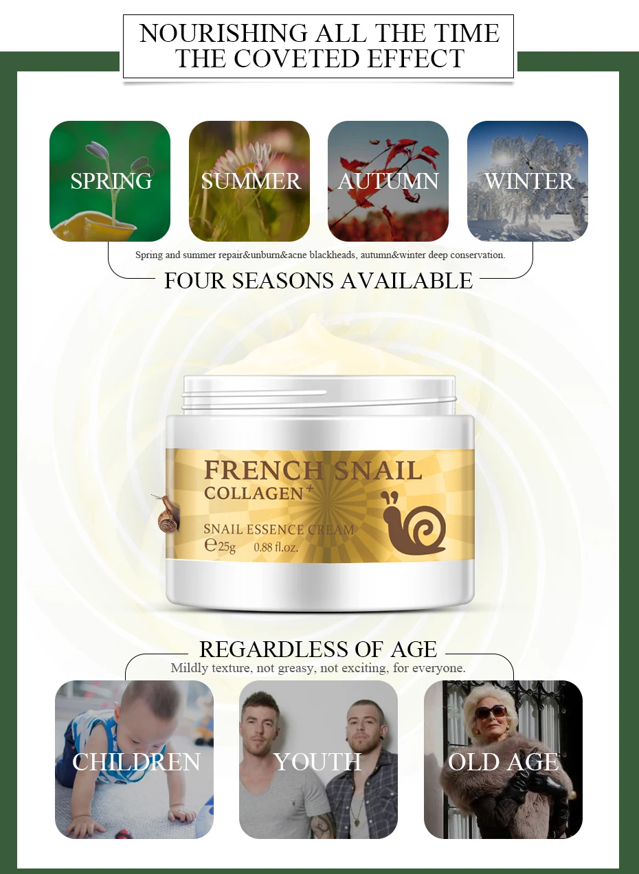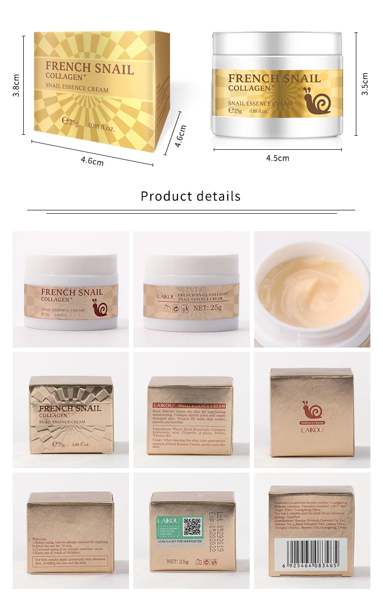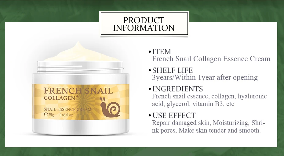 Название продукта: Коллаген, гиалуроновая кислота, крем Улитка против морщин против старения отбеливающий увлажняющий крем Эффективность: восстанавливает поврежденную кожу, увлажняет кожу, уменьшает поры, делает кожу мягкой и гладкой. Характеристики продукта: он обладает отличной прочностью для восстановления различных проблем с кожей и делает вашу кожу мягкой и гладкой. Четыре сезона могут улучшить жесткую и плотную кожу, питают нежность и гладкость.
