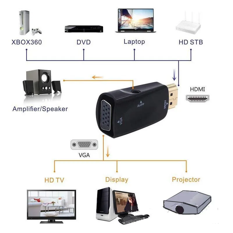 -- HDMI к VGA конвертер с 3,5 мм аудио порт может перевозить аудио и видео с HDMI Совместимое устройство с монитором или проектором с портом VGA одновременно. -- Встроенный активный чип IC преобразует цифровой сигнал HDMI в аналоговый сигнал VGA. Совместимость с HDCP; Идеально подходит для вашего ноутбука, ноутбука, HD DVD и других устройств HDMI. -Конвертер HDMI-VGA поддерживает высокое разрешение, разрешение до 1920x1080(1080p Full HD) Включая 720p и 1600x1200 для HD мониторов или проекторов. -Конвертер HDMI-VGA совместим с настольным компьютером, Ноутбук, ультрабук, ноутбук, Intel Nuc, Raspberry Pi,Chromebook,TVBOX ,Roku streaming media player,Xbox, STB, DVD или другие устройства с портом HDMI. VGA женский порт может быть подключен к проекторам, HDTV, мониторам, Displayer ЖК-дисплей и другие устройства с портом VGA male. 3,5 мм аудио разъем кабель может быть подключен к динамик, разъем для наушников, усилитель И других устройств. -Позолоченный интерфейс HDMI устойчив к коррозии и истиранию и повышает производительность передачи сигнала. Особенности 1. Супер маленькая концепция дизайна, которая является первым Кари 2. Поддержка plug and play, нет необходимости в источнике питания 3. Разрешение продукта до 720P/1080I/ 1080P 4. Аудиовыход: 3,5 аудио разъем/3,5 к R + L 5. Формат входного видео HDMI: 480i/576i/480p/576p/720p/1080i/1080p 6. Формат вывода видео VGA: 480i/576i/480p/576p/720p/1080i/1080p
