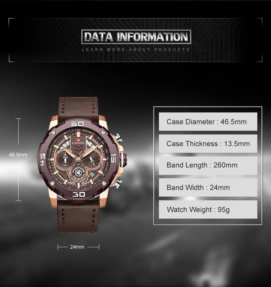 Модель: NAVIFORCE NF9175 Часовой механизм: кварцевый механизм Сталь Материал ремешка: Диаметр циферблата: 46,5 мм Чехол Толщина: 13,5 мм Группа Длина: 25,5 мм Ширина ремешка: 22 мм Вес изделия: 175 г Кожаный ремешок: Диаметр циферблата: 46,5 мм Чехол Толщина: 13,5 мм Длина ремешка: 26 мм Ширина ремешка: 22 мм Вес изделия: 95 г Пол: мужские часы и мужские часы Стиль: модные часы и деловые часы и спортивные наручные часы Материал циферблата: закалённое минеральное стекло Материал ремешка: натуральная кожа/стальной ремешок Тип застежки: Пряжка/пряжка на крючке Характеристики: время, водонепроницаемость 30 м, отображение даты недели светящиеся стрелки, хронограф