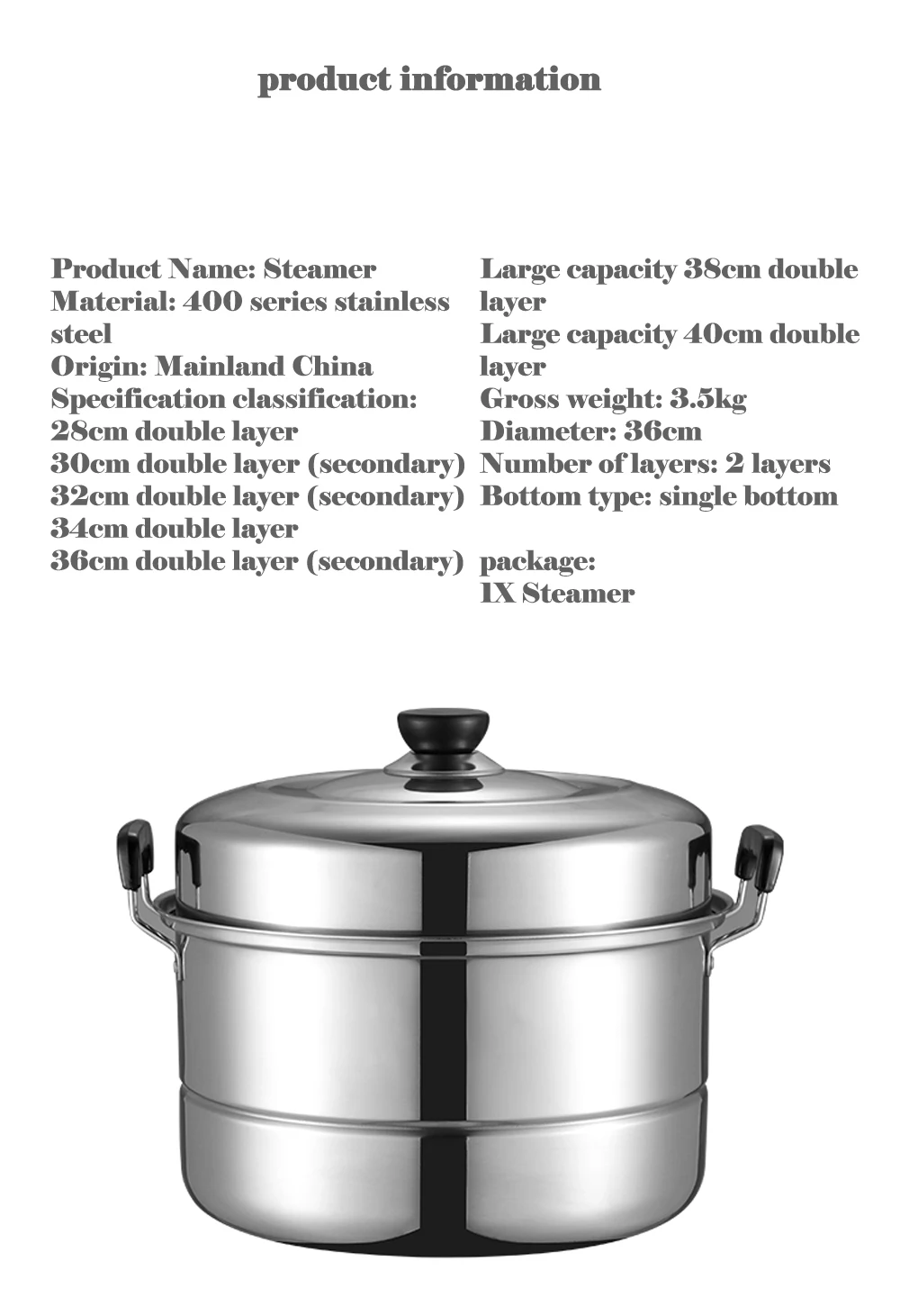 Название продукта: пароварка Материал: нержавеющая сталь серии 400 Страна происхождения: Китай (материк) Параметры классификация: 28 см двойной слой 30 см двойной слой (вторичный) 32 см двойной слой (вторичный) 34 см двойной слой 36 см двойной слой (вторичный) Большой объем 38 см двойной слой Большой объем 40 см двойной слой Вес брутто: 3,5 кг Диаметр: 36 см Количество слоев: 2 слоя Тип подошвы: однодонный Посылка: 1X пароварка Демонстрация покупателя