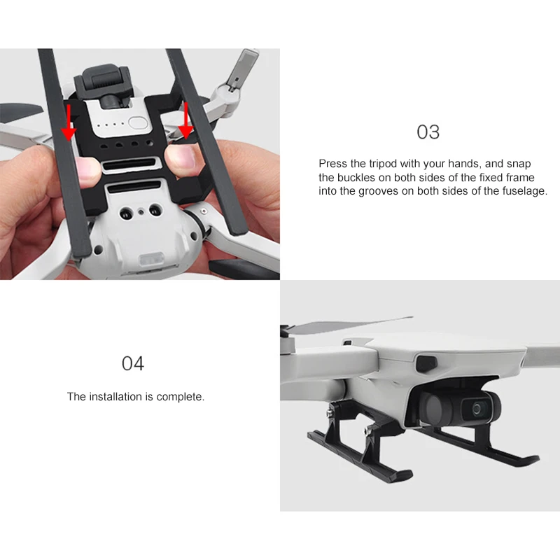 Нажмите на боковые стороны штатива внутрь руками, слегка деформируйте и выровняйте пряжку с соответствующим канавкой в нижней части фюзеляжа. Вставьте пряжку в паз в нижней части фюзеляжа. Нажмите на штатив руками и Защелкните пряжки с обеих сторон держателя в пазы с обеих сторон фюзеляжа.