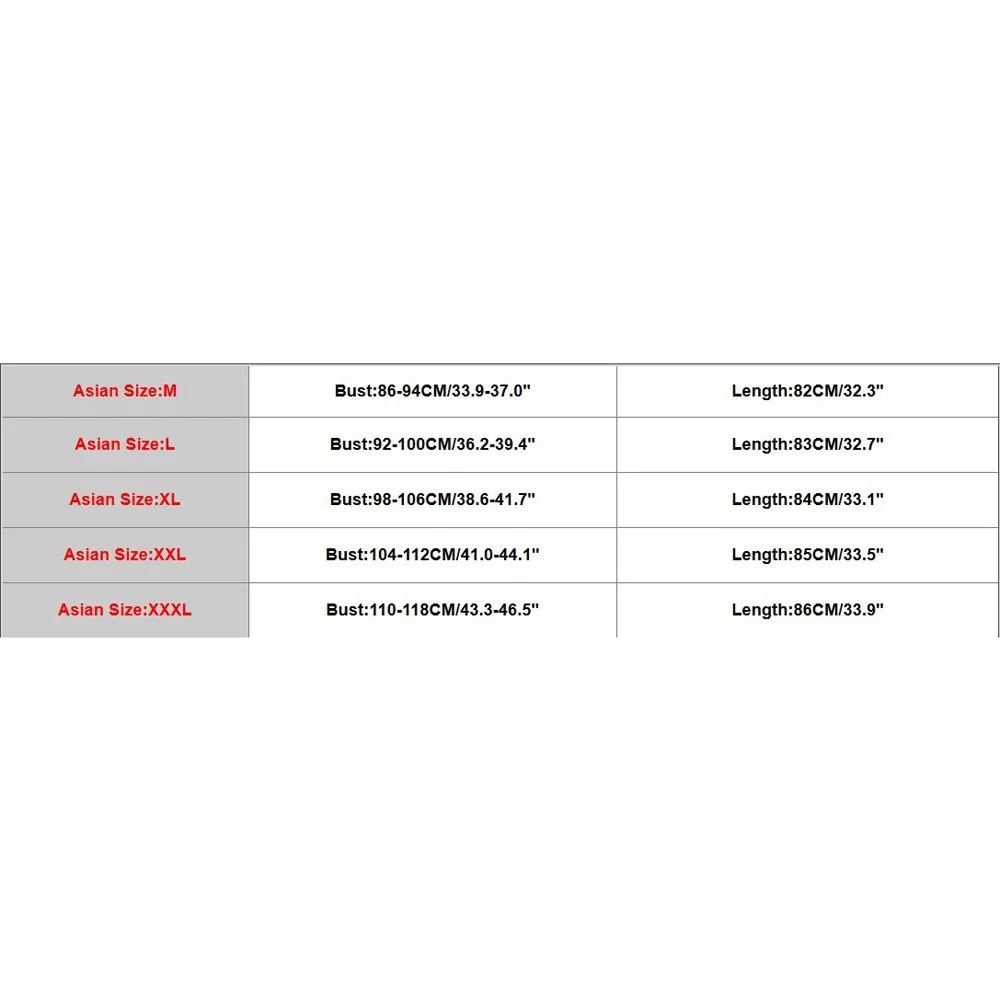 АзиатскийРазмеры:М Бюст: 86-94 см/33,9-37,0" Рукава: 14 см/32,3" Длина: 82 см/32,3" АзиатскийРазмеры:L Бюст: 92-100 см/36,2-39,4" Рукава: 15 см/32,3" Длина: 83 см/32,7" АзиатскийРазмеры:XL Бюст: 98-106 см/38,6-41,7" Рукава: 16 см/32,3" Длина: 84 см/33,1" АзиатскийРазмеры:XXL Бюст: 104-112 см/41,0-44,1" Рукава: 17 см/32,3" Длина: 85 см/33,5" АзиатскийРазмеры:XХХL Бюст: 110-118 см/43,3-46,5" Рукава: 18 см/32,3" Длина: 86 см/33,9"