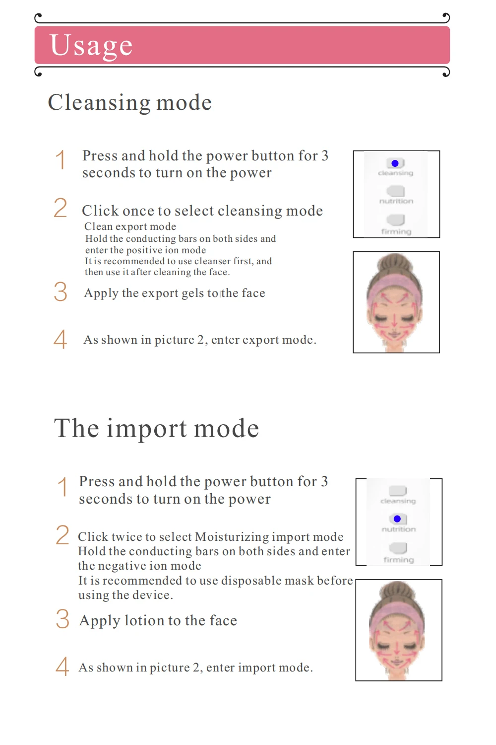1. Не используйте это устройство вокруг глаз, поврежденной кожи, дерматита, вызванного косметикой, акне воспаленных частей, или реформирующих частей. 2. Это устройство будет иметь низкий уровень шума из-за ультразвуковой вибрации, это нормальное явление, пожалуйста, не стесняйтесь использовать. 3. Помните, что это устройство должно использоваться с кремом для кожи или жидкостью, вы не можете использовать его в сухих условиях. 4. Дети, беременные женщины и больные тяжелыми сердечными заболеваниями не могут использовать это устройство. 5. Пожалуйста, держите руки сухими при использовании этого устройства, в противном случае источник питания может быть коротким. 6. После использования протрите зонд сухой тканью и дезинфицируйте его спиртом.