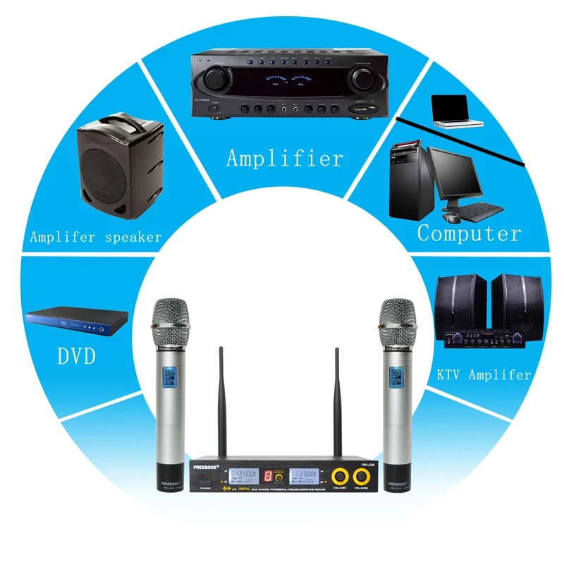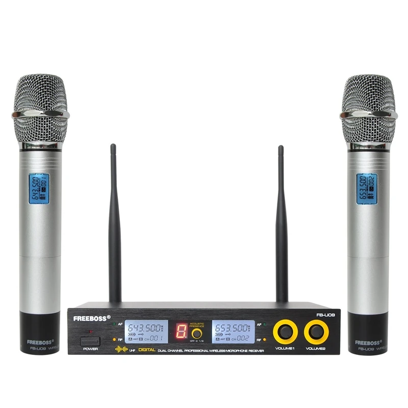 Freeboss FB-U09-S двухсторонний цифровой UHF беспроводной микрофон с фиксированной частотой с 2 металлическими ручками серебристого цвета