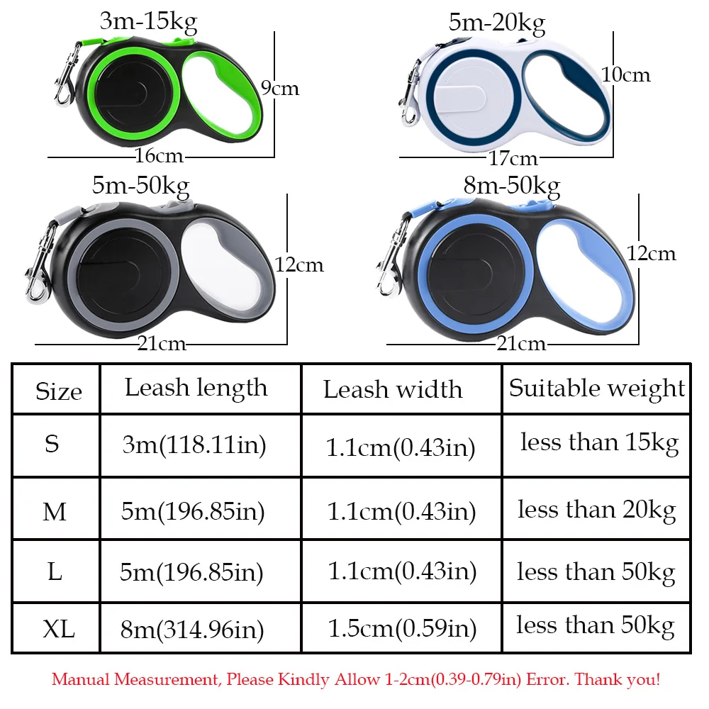 Длина поводка 5 м (196,85 дюйма), ширина поводка 1,1 см (0,43 дюйма), подходит для домашних животных весом менее 50 кг.