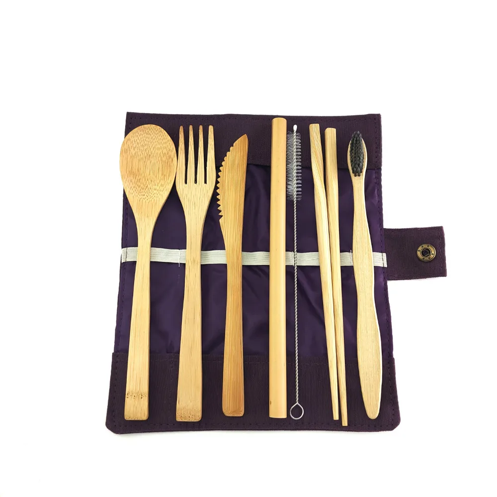 Бамбуковая посуда, дорожный набор столовых приборов с зубной щеткой, Экологичная деревянная уличная портативная посуда, Набор бамбуковых столовых приборов