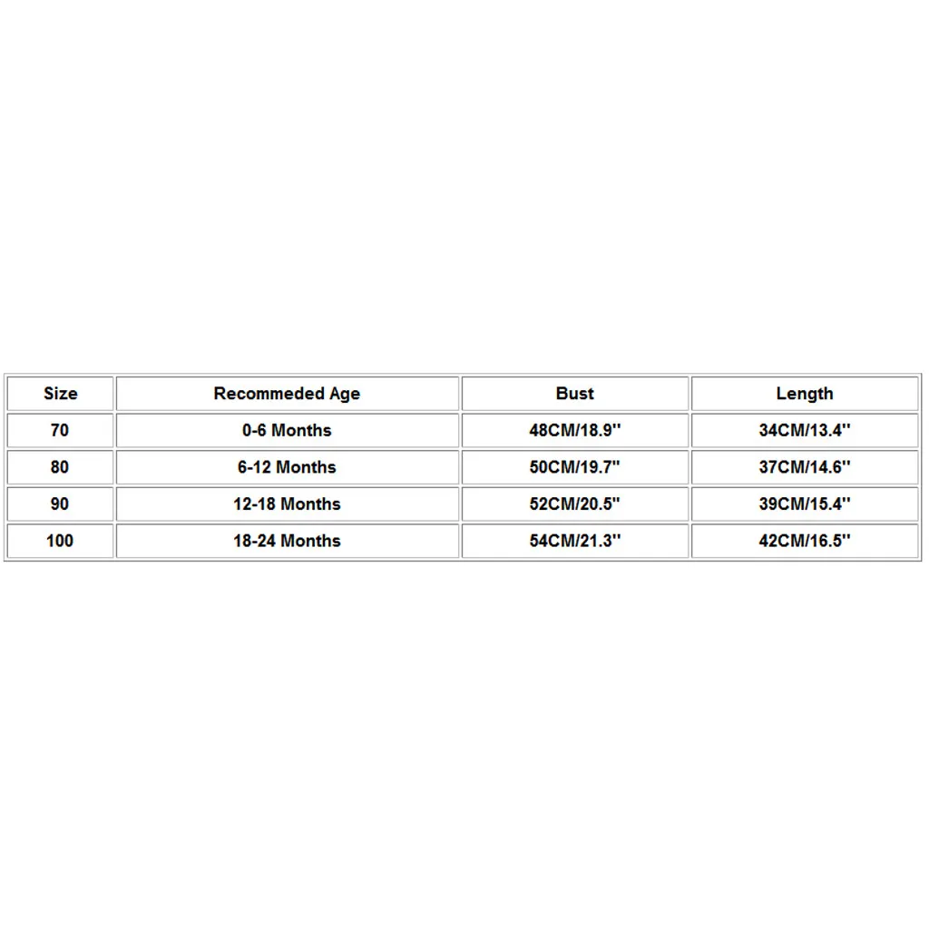 Размеры Рекомендуемый возраст Обхват груди Длина 70 Для детей от 0 до 6 месяцев 48 см/18,9'' 34 см/13,4'' 80 6-12 месяцев 50 см/19,7" 37 см/14,6'' 90 12-18 месяцев 52 см/20,5" 39 см/15,4'' 100 18-24 месяцев 54 см/21,3'' 42 см/16,5''