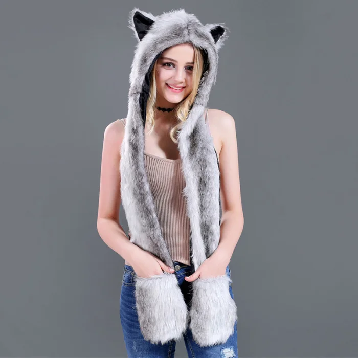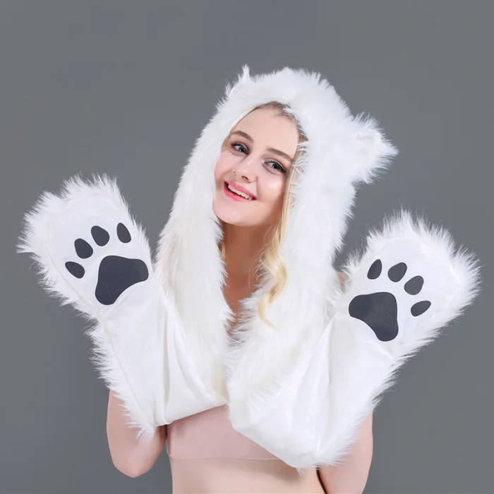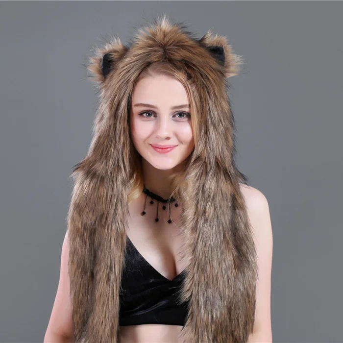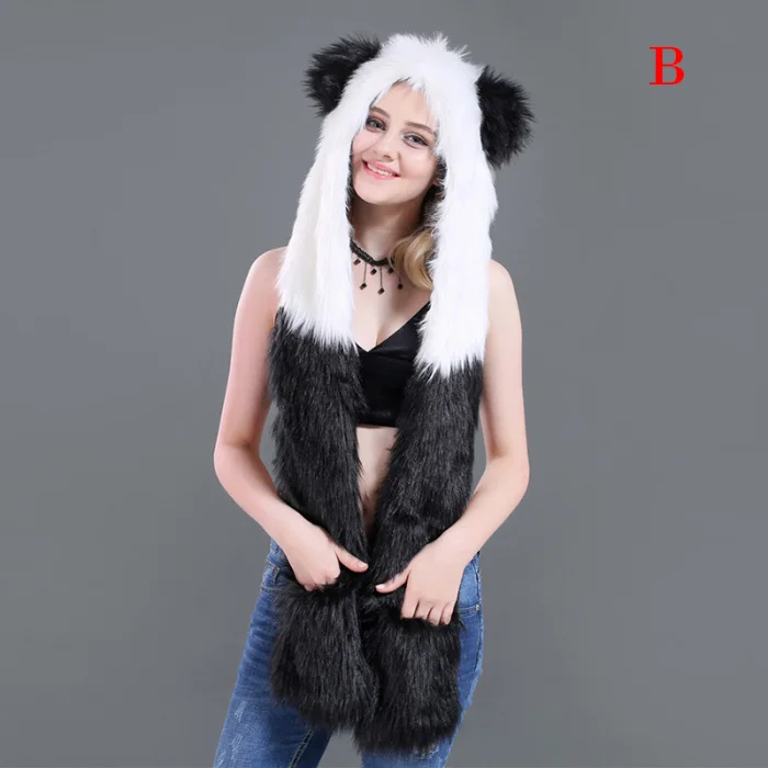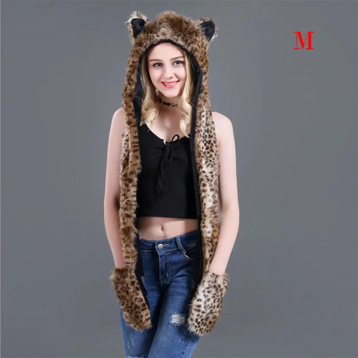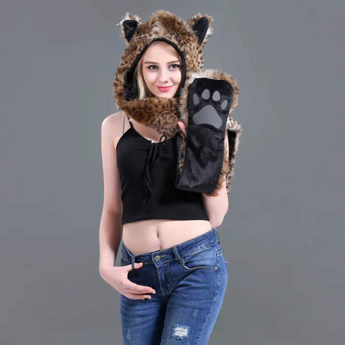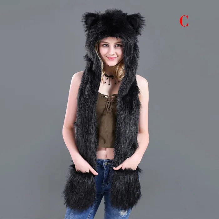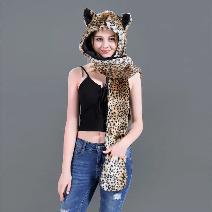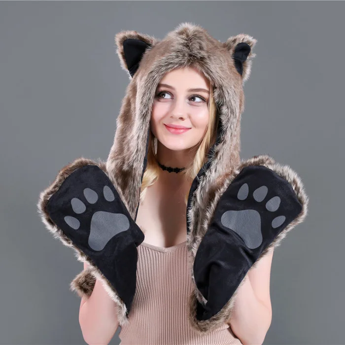 Шапка с искусственным мехом, шапка, шарф, перчатки, зимние варежки, 3 в 1, функциональная толстовка с капюшоном и ушками, GDD99