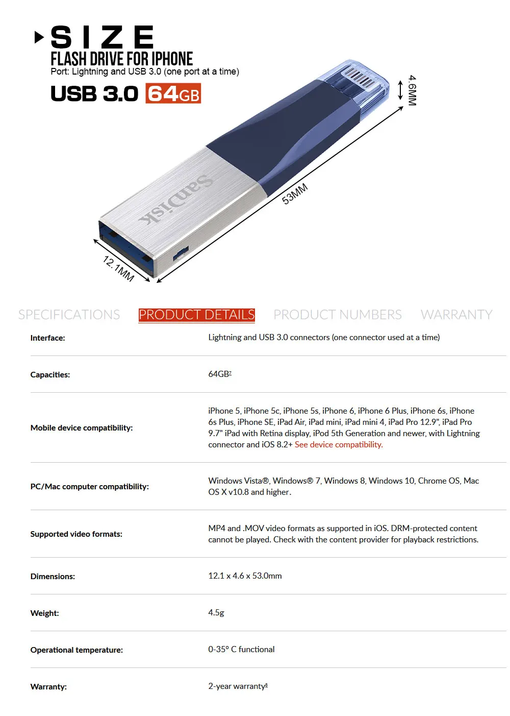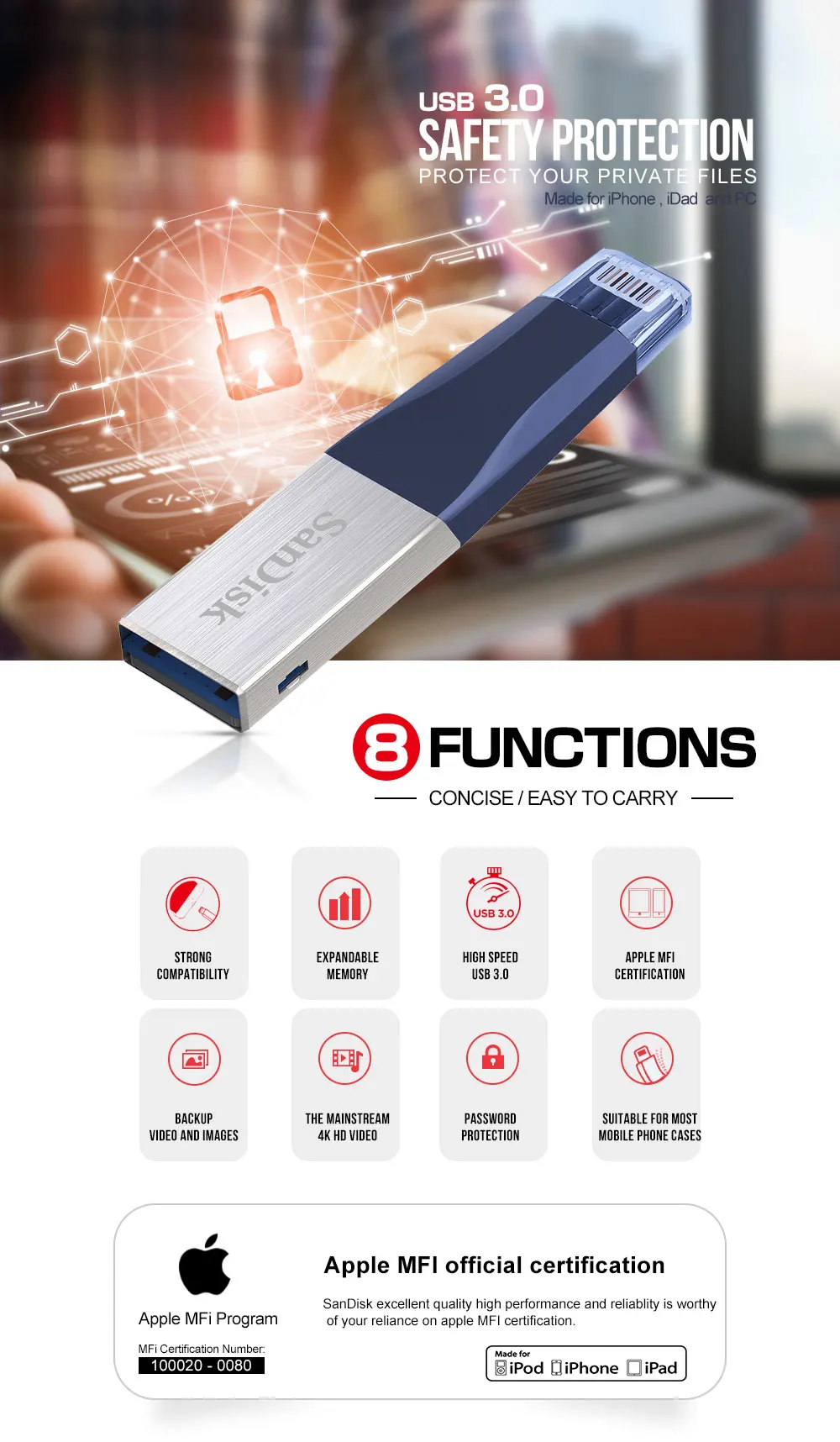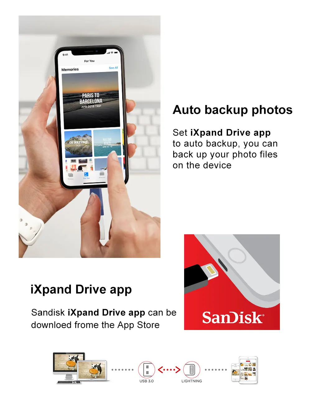 Prueba segus el tipo de пуерто para probar los discos flash. Si no, la velocidad se reducira. ** El диско мигать ve muy afectado por el электронные tarjetas, адаптер, Эль-порт USB и т. Д. el многофункциональное de baja качество 100% retrasará за de la карты. ** Basado en pruebas internas; el rendimiento puede ser menor dependiendo del dispositivo host, la mwaz, las condiciones de uso y otros factores. Aproximado capacidad оборотные: 32 Гб = проксимадамент 28 ГБ ~ 30 Гб 64 ГБ = проксимадаменте 58 ГБ ~ 60 Гб 128 ГБ = Приблизительно 115 ГБ ~ 118 ГБ 256 ГБ = приблизительно 230 ГБ ~ 236 ГБ 1) совместим с iPhone 5/5C/6/6 s/6 plus/7/7 plus/8/8/X/XR/xs/y nuevos iPad aire iPad con pantalla retina (4 хенерасьон»), iPad mini с панталлой сетчатки, iPad mini y mаs reciente, aplición de unidad iXpand e iOS 8,2 necesarios. 2. Disponible para descargar en la App Store. Se requiere 8,2 iOS. Configar copia de seguridad automatica dentro de la configation de la aplicación. 3. Soporte para. ¿WMV? ¿AVI? ¿MKV? ¿MP4? Formatmov formatos de Video? El contenido protegido por DRM no se puede transmitir. Consulta con el proveedor de contenido las restricciones de reproducción. 4. Защита от использования AES 128 bits y es Совместимость с iOS 8,2, Mac OS X v10.6 +, Windows Vista®Windows®7, Windows 8 y Windows 10. Para Китай: Совместимость с iOS 8, Mac OS X v10.6 +, Windows®Windows XP/Vista/®Windows®7 Windows 8 лет Windows 10 5 1 ГБ = 1.000.000.000 байт Almacenamiento de usuio real menor. 6 Ver www.sandisk.com/wug