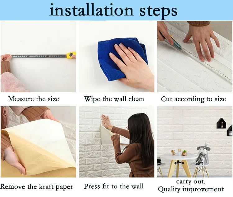 1: трехмерная декоративная мягкая пена, защита от столкновений для детей, забота о вашей семье. 2: Безопасность и защита окружающей среды, нетоксичный запах, подходит для семейного безопасного домашнего пространства. 3: похожая на настоящую, натуральный кирпич интерференционный эффект, простой и современный стиль. 4: Бесплатный DIY, простой самоклеящийся дизайн, установка, повседневный коллаж, произвольный крой. 5: сравнение обоев с улучшенным эффектом шумоподавления.