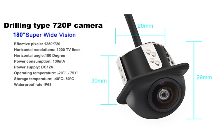 20 мм сверлильный Тип 720P камера/горизонтальный угол 180deg Датчик изображения: OV HD чипы ТВ система: PAL/NTSC опционально Эффективные пиксели: 1280*720 Горизонтальное разрешение: 1000 ТВ-линий Горизонтальный угол: 180 градусов Зона обнаружения: 3,8 мм * 2,9 мм Скорость затвора: 1-1/12000 Гамма-номер: 0,45 Минимальная освещенность: 0,01 Lux/F = 1,2 (0 Люкс с ИК вкл.) Видео выход: RCA разъем/CVBS Потребляемая мощность: 130 мА Источник питания: DC12V Рабочая температура: -20 ℃ - 75 ℃,RH 95% MAX Температура хранения: -40 °C- 80 °C RH95 % MAX Степень водонепроницаемости: IP68 Цветная камера ночного видения