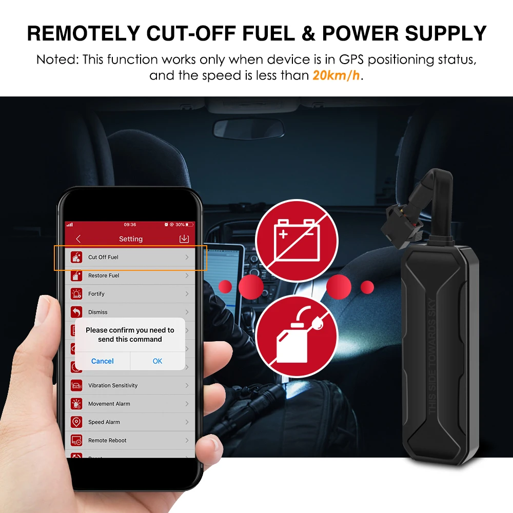 Защитите свой автомобиль от воров; Когда подача электричества отключена, он активирует сигнал отключения и отправит соответствующие SMS на номера SOS и наберет нумберзиновые круги.