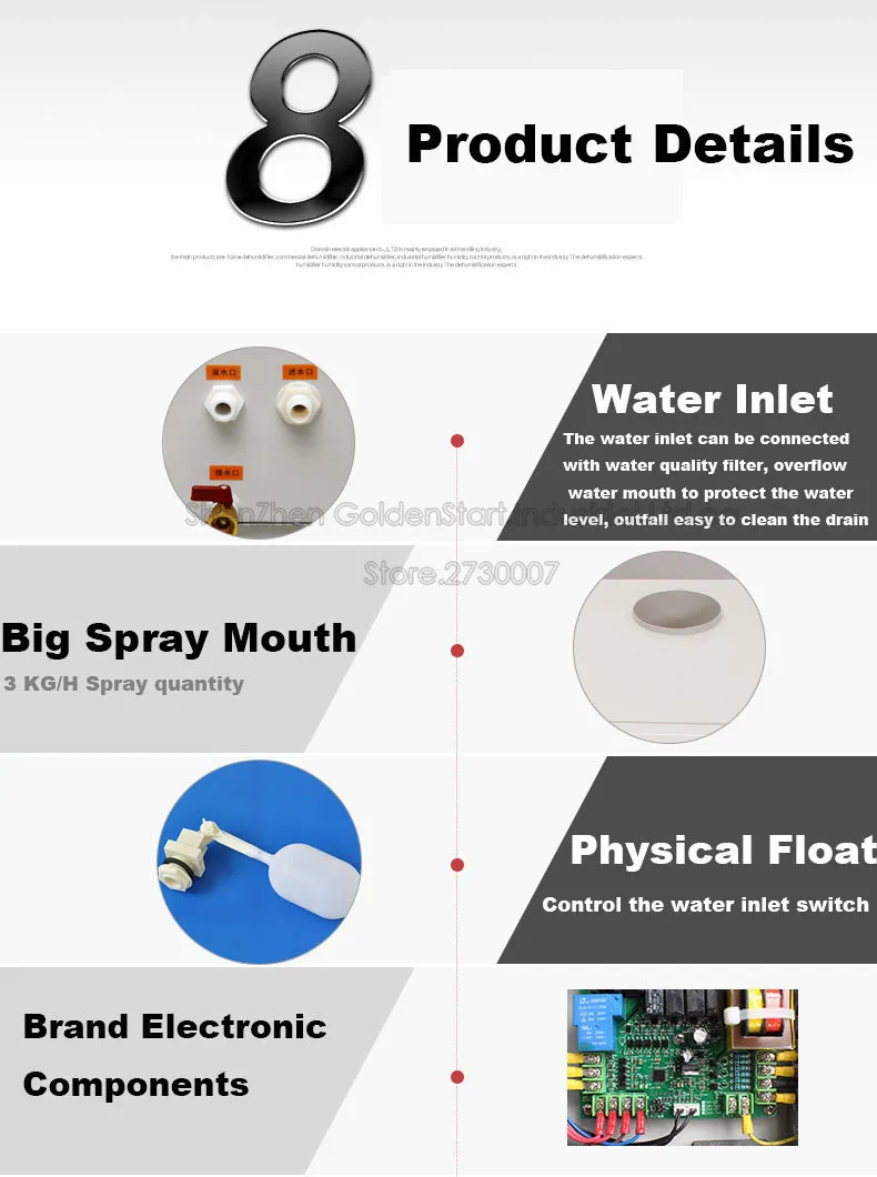 ● Датчик влажности, импортированный из Японии, может быть установлен в соответствии с вашими потребностями. Диапазон контроля влажности RH30 % -RH95 %;