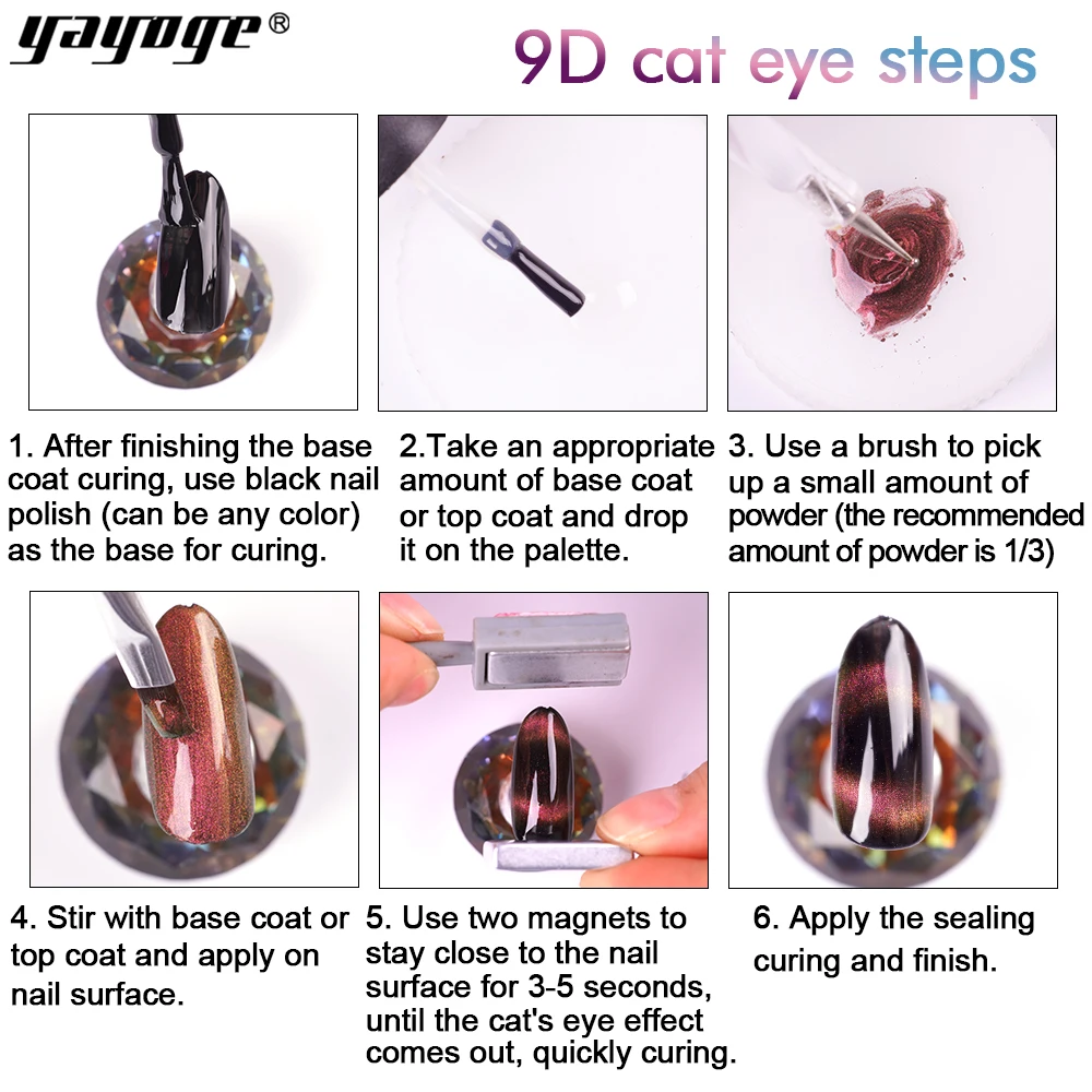 Параметры: Количество: 1 коробка Ёмкость: прибл. 0,2 г Материал: порошок Цвет: как показано на фотографии Посылка в комплект входит: 1 коробка 9D порошок для ногтей кошачий глаз Особенности: 2-в-1 продукт, который может достичь эффекта, волшебное зеркало, порошок и 9D Гель-лак «кошачий глаз». Цветной зеркальный эффект: 1. Подготовьте ногти с помощью УФ-покрытия, цветного геля. (Рекомендуется Черный или другие глубокие цвета) 2. Не протирайте УФ верхнее покрытие, вылечивайте его под УФ-лампой или светодиодный лампой, пока он не будет полностью стараться. 3. Используйте тени для век, чтобы выбрать пудру и наносить ее на ногти 3. Повторите шаг, пока вы не удовлетворены эффектом. 4. Уплотните его УФ-покрытием. Инструкции по использованию: Эффект кошачьих глаз: 1-Возьмите Базовое покрытие или верхнее покрытие и положите его на палитру (Возьмите соответствующее количество верхнее покрытие или Базовое покрытие в зависимости от площади поверхности ногтя) 2-используйте кисть, чтобы окунуть небольшое количество порошка (Рекомендуемое количество пудра составляет одну третью от количества основного покрытия или верхнего покрытия), затем равномерно размешать и нанести его на поверхность ногтя без отверждения лампой. 3. Используйте два магнита, чтобы оставаться на поверхности ногтя в течение 3-5 секунд. После того, как эффект кошачьего глаза выльется, быстро вылечивайте лампу. 4-щетка лаки для ногтей, а затем вылечить лампы.
