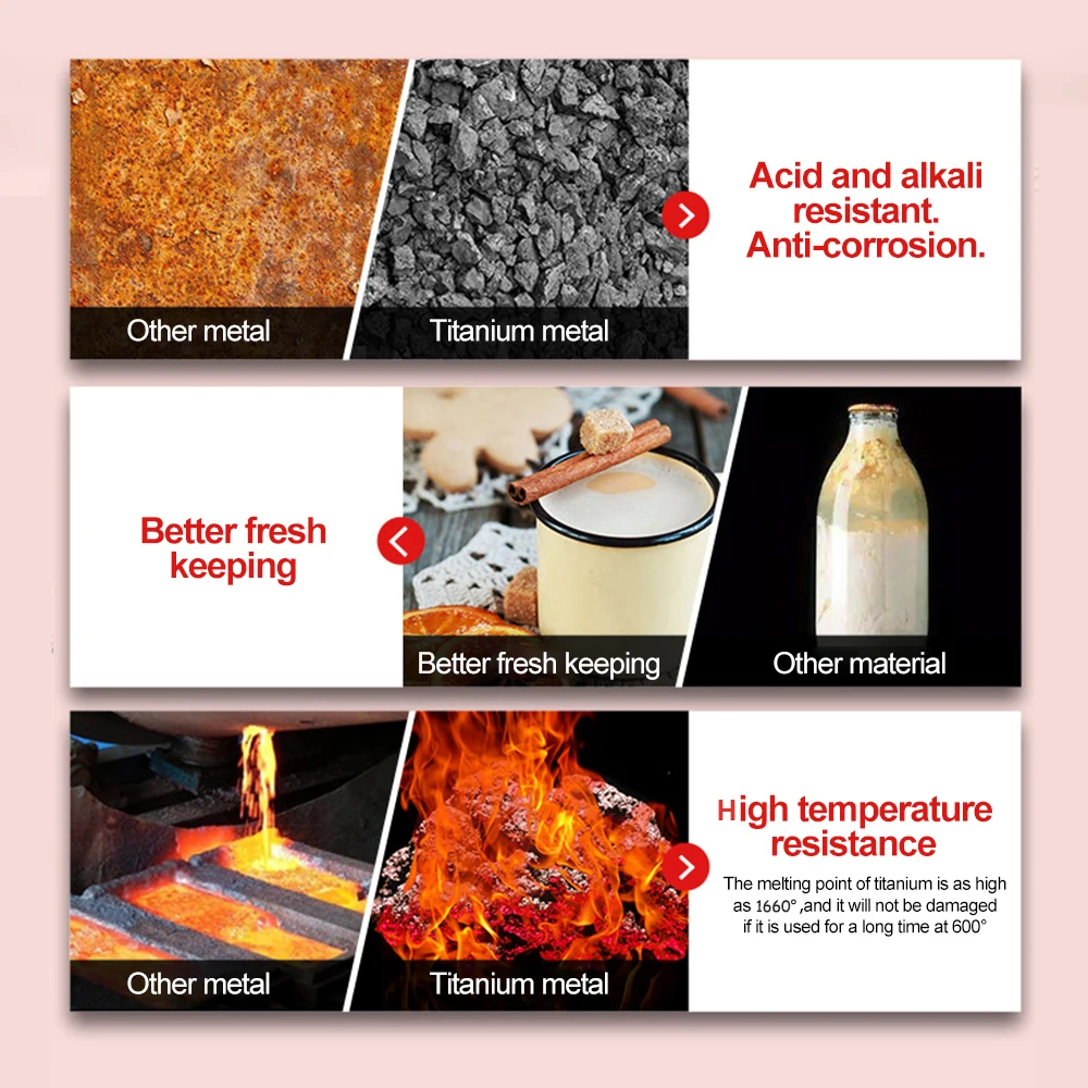 【Titanium】Titanium признан нетоксичным элементом в мире. Кислота и щелочь устойчивы. Защита от коррозии. Не ржавеет. Непросто размножать бактерии. Хорошая устойчивость. Он не реагирует химически на кофе, чай, молоко, сок и т. Д., и может действительно держать любой напиток. Оксидная пленка на поверхности титана, которая замедляет рост бактерий. Сделайте ингредиенты более свежими и удваивайте время сохранения.