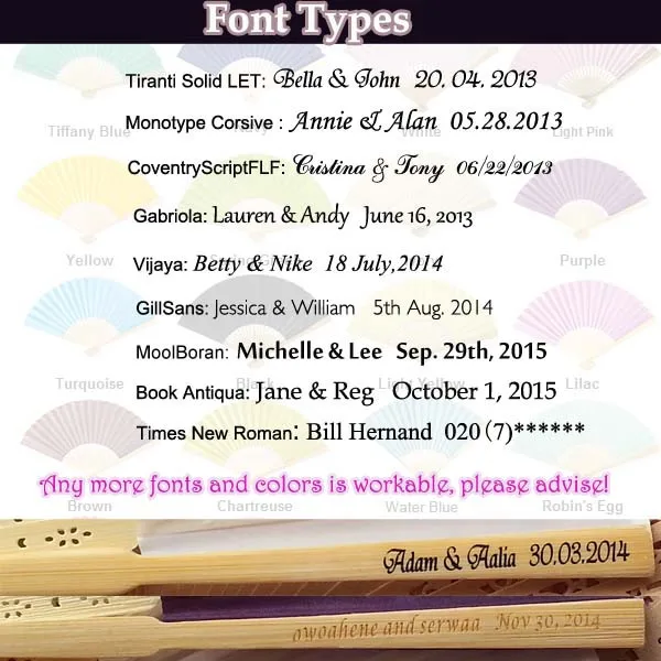Hand fan are extremely popular as party decorations,wedding favors,wedding photo props,home decoration,bride wedding party usage.Hand fan make beautiful of all of you.Hand fan can keep you cool in summerHand fan can be taken for dancing and displaying in theate.Perfect for crafts,festivals,parties and weddings.Fan long37cmI could print Groom & Bride names and date word on your personalized wedding favors for guests When you order, please offer the following:Printing text:Printing fonts:You can choose fonts from the following: