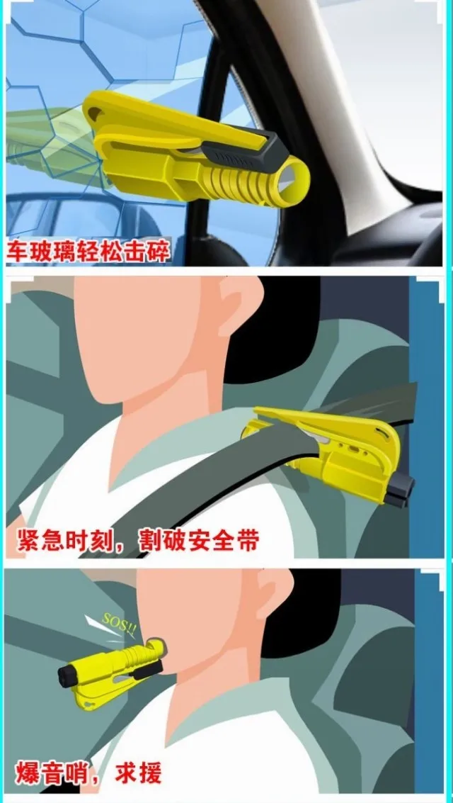 Компактное приспособление, которое удобно хранить под рукой, поможет быстро выбраться из автомобиля в экстренной ситуации. Безопасное лезвие эффективно разрезает ремни безопасности. Острый стальной наконечник под давлением пружинного механизма выбивает окно. Повесьте брелок на ключи или поместите его на зеркало заднего вида. Не стоит прятать приспособление в бардачок или под сиденье, иначе оно может оказаться бесполезным в случае аварии. При возникновении аварийной ситуации поместите ремень в отверстие со скрытым лезвием, прижмите его и с силой потяните. Таким же образом разрежьте и ремни пассажиров. Чтобы выбить окно, поставьте брелок перпендикулярно к стеклу пружинным механизмом и с усилием надавите -механизм сработает самостоятельно и разобьет окно. Не работает на лобовом стекле. Наиболее эффективные точки воздействия для разбития расположены в углах стекол на дверях автомобиля.