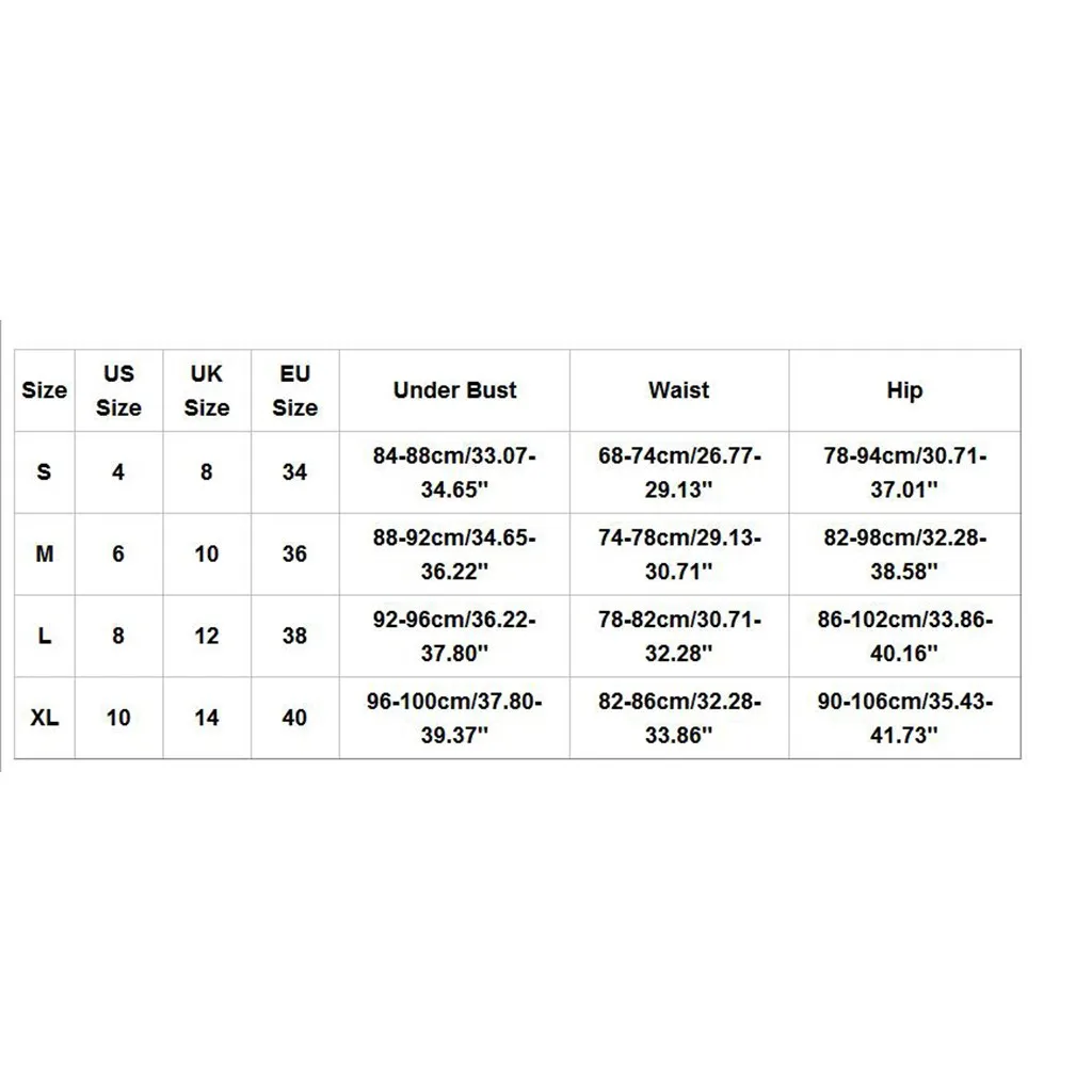 Размер Нам Размеры UK Размеры ЕС Размеры Обхват под грудью Обхват талии Обхват бедер S 4 8 34 84-88 см/33,07-34,65" 68-74 см/26,77-29,13" 78-94 см/30,71-37,01" М 6 10 36 88-92 см/34,65-36,22" 74-78 см/29,13-30,71" 82-98 см/32,28-38,58" L 8 12 38 92-96 см/36,22-37,80" 78-82 см/30,71-32,28" 86-102 см/33,86-40,16" XL 10 14 40 96-100 см/37,80-39,37" 82-86 см/32,28-33,86" 90-106 см/35,43-41,73"