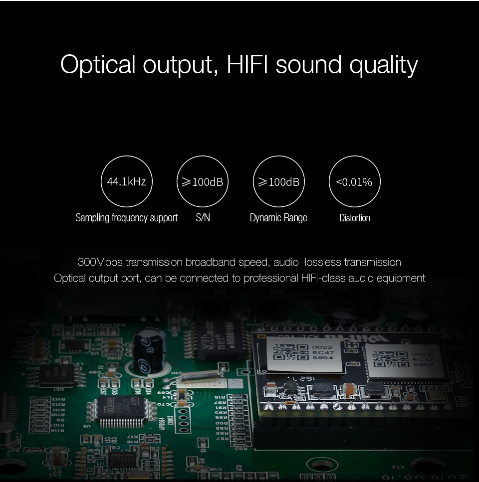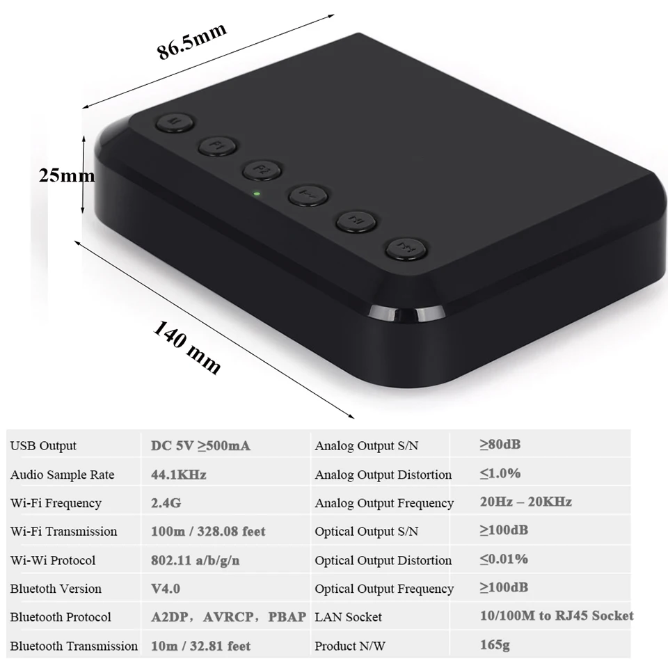 SNR: ≥ 80 дБ Искажение: ≤ 1.0% при 1 кГц Wi-Fi диапазона: 2,4 ГГц Диапазон работы Wi-Fi: до 100 м Профиль Wi-Fi: 802,11 a/b/g/n Версия Bluetooth: V4.0 Профили Bluetooth: A2DP, AVRCP, PBAP Рабочий диапазон Bluetooth: до 10 м (класс 2) Входная мощность: 5 В/500 мА постоянного тока Размеры: 140x86.5x25мм Вес нетто: 165 г