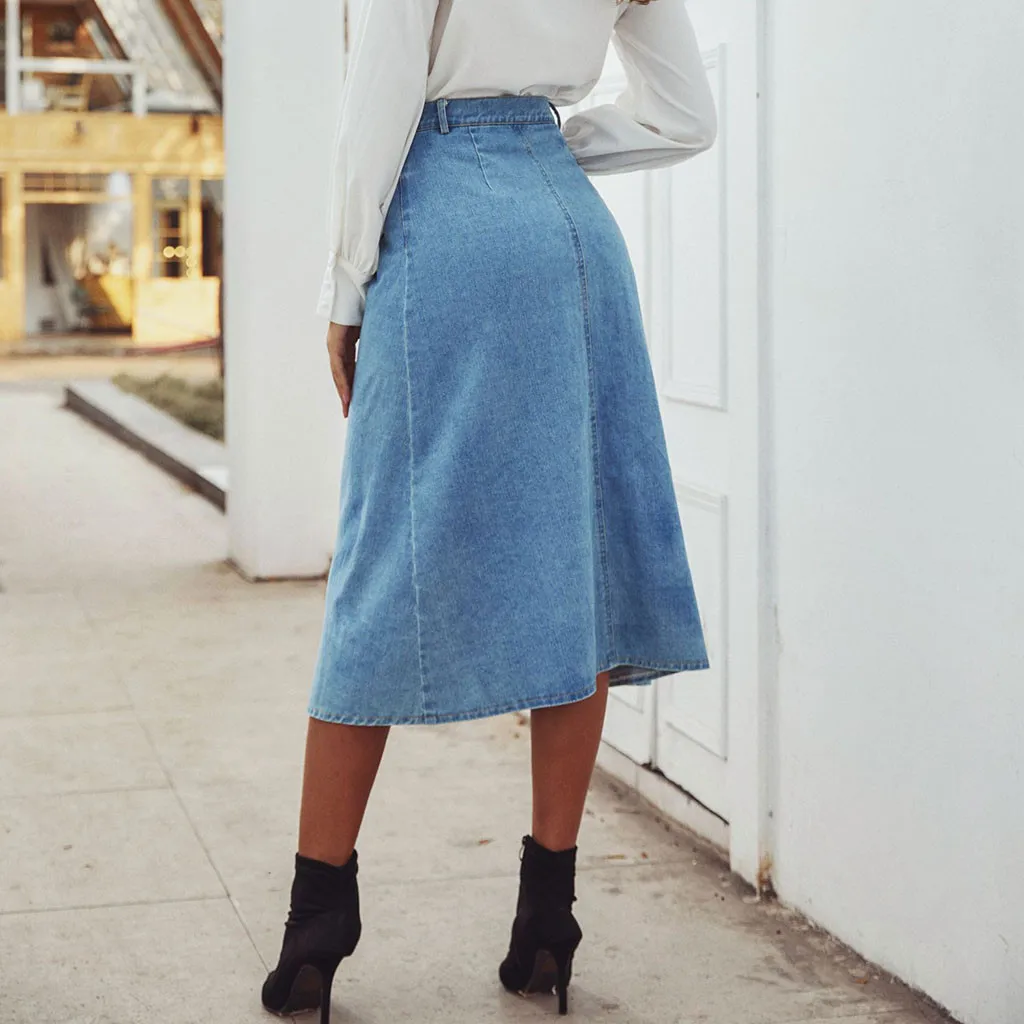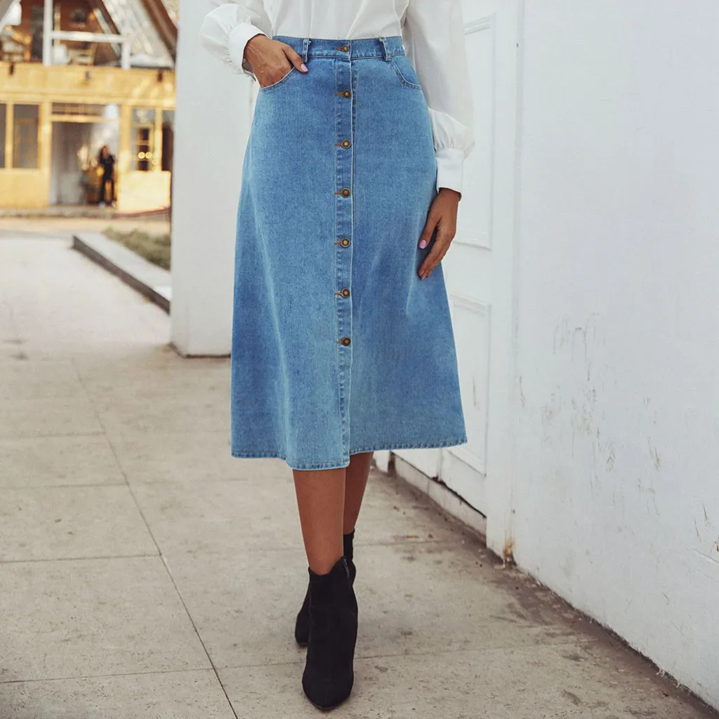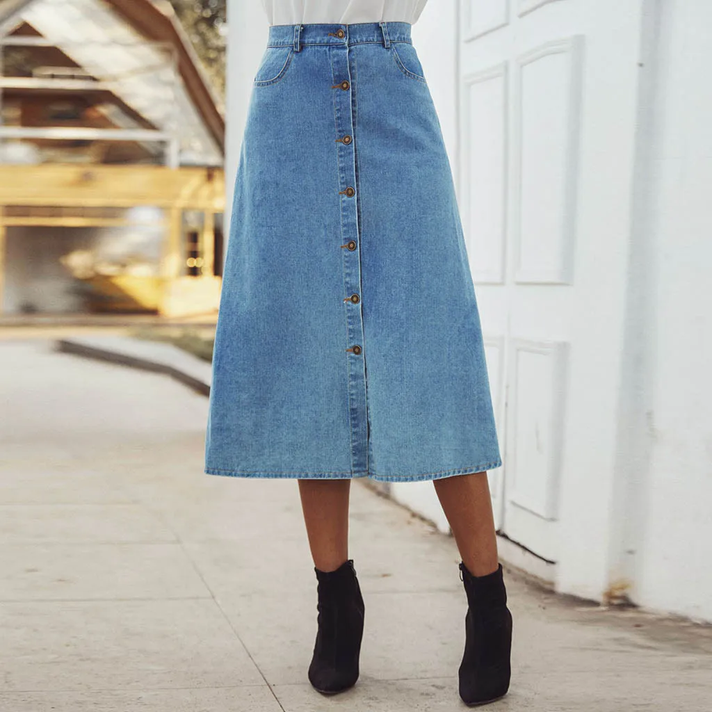Женская летняя джинсовая повседневная юбка на пуговицах с карманами