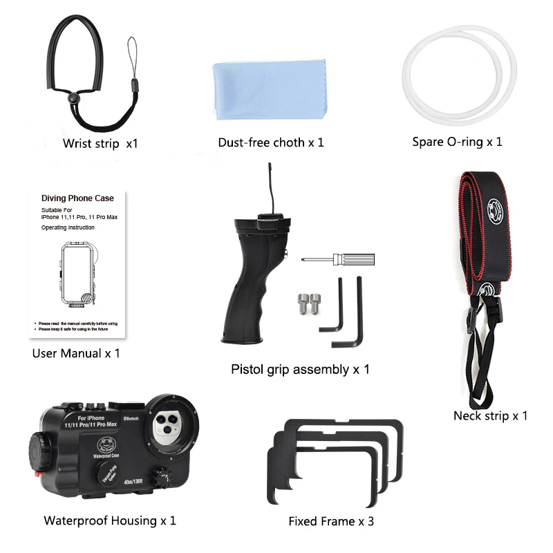 Пожалуйста, прочитайте руководство перед использованием водонепроницаемый чехол. Название продукта: водонепроницаемый чехол для iPhone 11/11pro/11pro max Бренд: seafrogs, meikon Материал: Поликарбонат, оптическое стекло, нержавеющая сталь, EPDM щебень, уплотнительное кольцо Уровень IP: IPx 8 Глубина погружения: макс. 40 метров (130 футов) Рабочая температура: 0-40 градусов Shochproof: 1 метр Вес: 490 г Водонепроницаемый элемент: уплотнительное кольцо уплотнительная прокладка Упаковка включает в себя: 1x водонепроницаемый чехол 1x ремешок на запястье 1x уплотнительное кольцо уплотнительная прокладка 1x ткань без пыли 1x Руководство пользователя