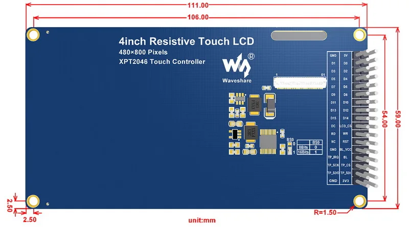 4-дюймовый 480 × 800 пикселей IPS LCD, резистивный сенсорный, 8080 Параллельный интерфейс