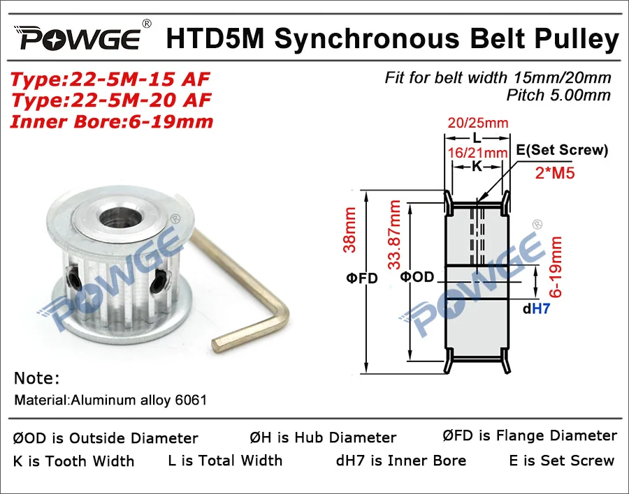 Arc Teeth Aluminum Alloy 22 Teeth HTD 5M Synchronous Timimg pulley Pitch 5.00mm Keyway bore 8/10/12/12.7/14/15/16/17/18/19/20mm 22-5M-15 AF and 22-5M-20 AF for Width 15mm/20mm HTD 5M Belt Pitch 5mm 22Teeth 22T HTD5M pulley Belt Laser Engraving CNC Machine