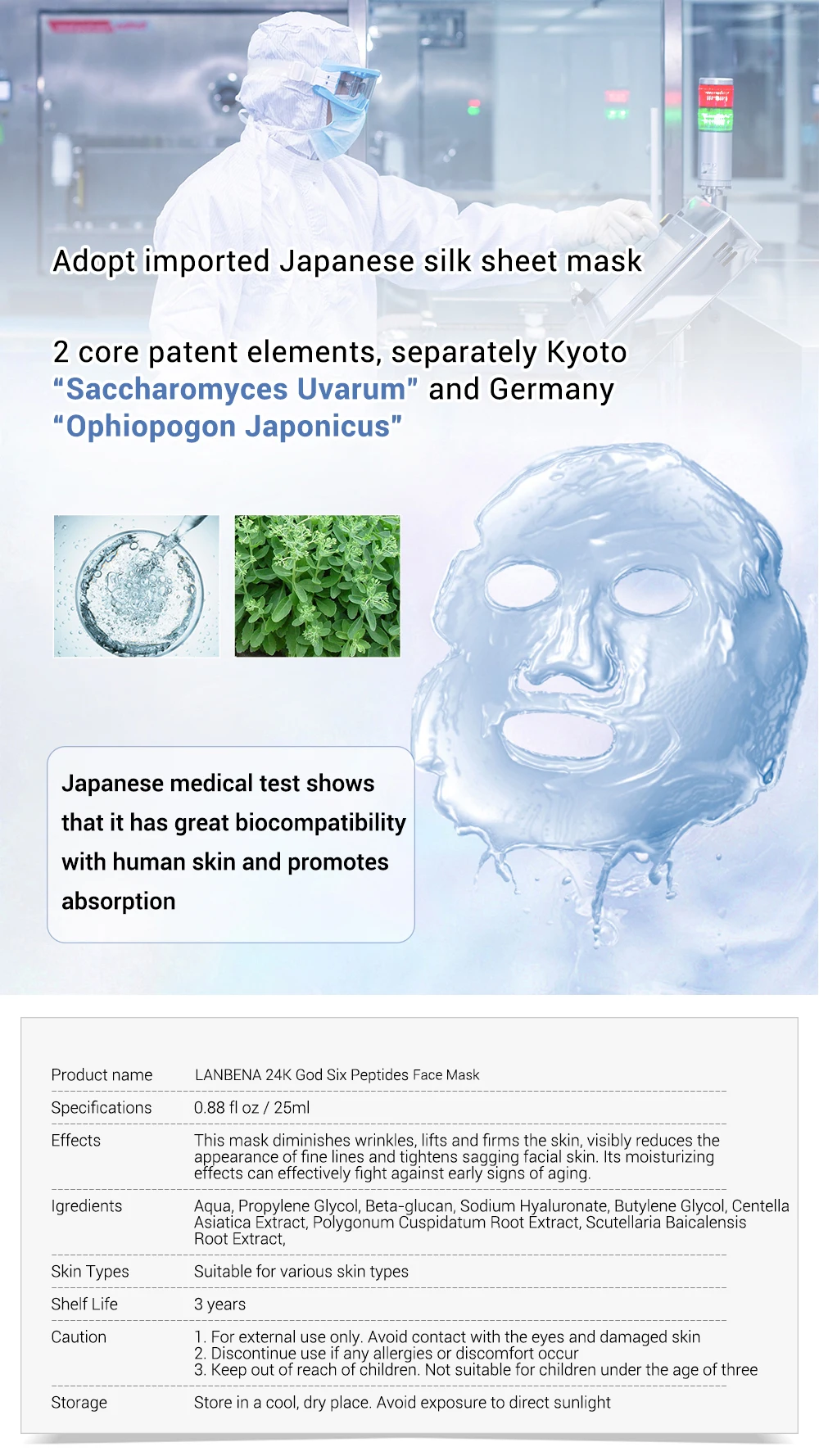 Модернизированная упаковка увеличивает свой объем, но не повышает цену Старая посылка 0,77 унций/22 мл Новая посылка 0,88 унций/25 мл Импортная японская Шелковая Маска Принимается импортная японская Шелковая Маска 2 основных патентных элемента 2 основных патентных элемента, отдельно от «сахаромиces Uvarum» и Германии «Ophiopogon Japonicus» Японский Медицинский Тест показывает, что он имеет большую биосовместимость с кожей человека и способствует поглощению Название продукта LANBENA 24K Золотая шесть Пептидов Маска для лица Технические характеристики 0,88 floz/25 мл Эта маска уменьшает морщины, подтягивает и укрепляет кожу, заметно уменьшает Внешний вид тонких линий и подтягивает провисшую кожу лица. Его увлажняющие эффекты могут эффективно бороться с ранними признаками старения. Igredients Aqua, пропиленгликоль, бета-глюкан, гиалуронат натрия, бутиленгликоль, экстракт центеллы Asiatica, экстракт корня куспидата полигония, экстракт корня Scutellaria Baicalensis, Типы кожи подходят для различных типов кожи Срок годности 3 года Внимание 1. Только для внешнего использования. Избегайте контакта с глазами и поврежденной кожей 2. Прекратите использование при возникновении аллергии или дискомфорта 3. Хранить в недоступном для детей месте. Не подходит для детей в возрасте до трех лет Хранение в прохладном сухом месте. Избегайте воздействия прямых солнечных лучей