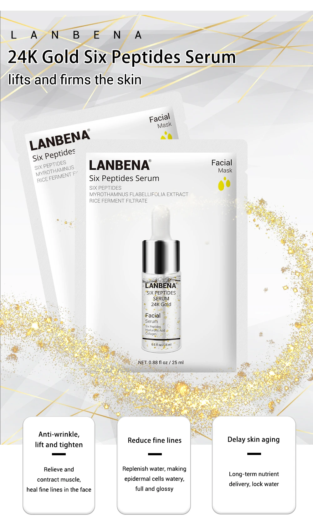 Ланбена 24K золото шесть сыворотка с пептидами Подтягивает и укрепляет кожу Против морщин, подтяните и затяните Снимайте и сжимайте мышцы, излечивайте тонкие линии лица Уменьшение тонких линий Пополняйте воду, делая эпидермальные клетки водяными, полными и глянцевыми Задержка старения кожи Долгосрочная доставка питательных веществ, Блокировка воды