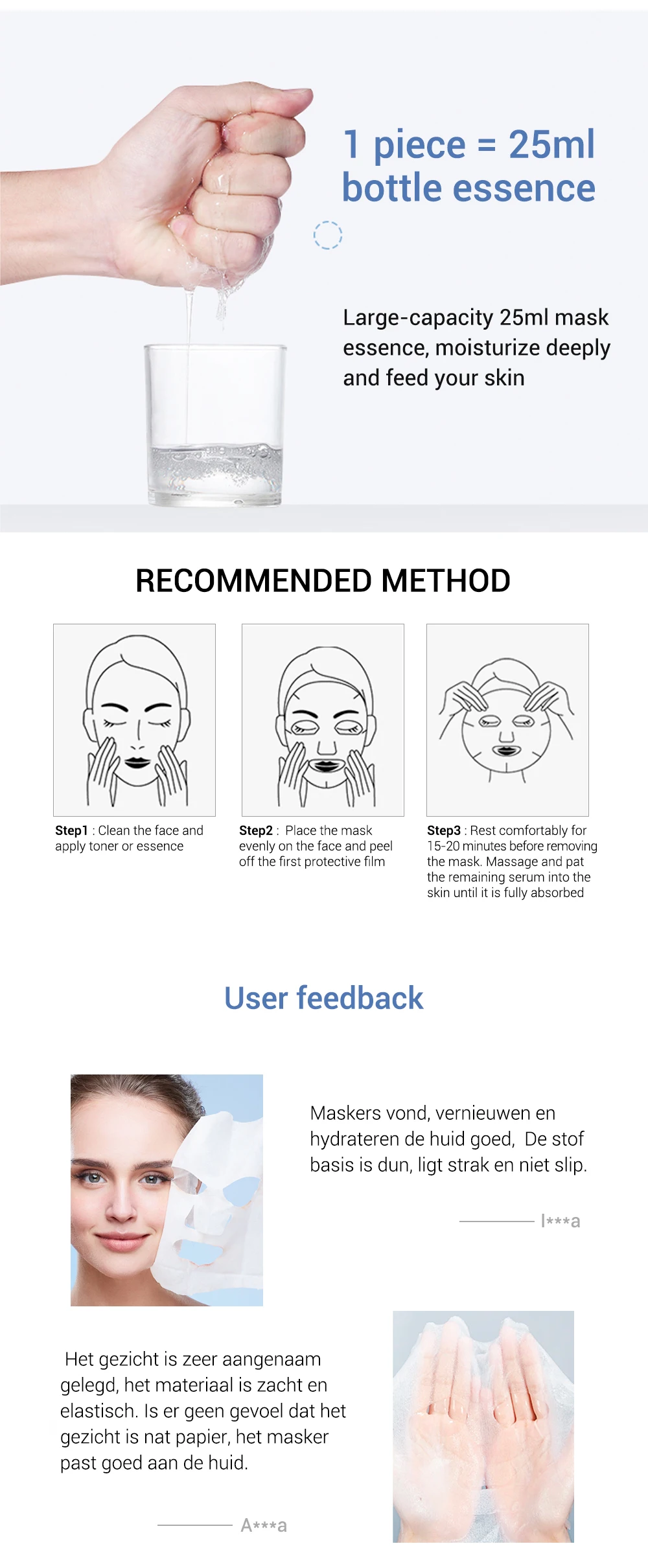 1 штука = 25 мл бутылка эссенция Большая емкость 25 мл маска эссенция, глубоко увлажняет и питает кожу Рекомендуемый метод Шаг 1: очистите лицо и нанесите тонер или эссенцию Шаг 2: равномерно Поместите маску на лицо и снимите пихту Шаг 3: Расслабьтесь в течение 15-20 минут перед удалением маски. Массаж и ПЭТ Оставшаяся сыворотка в коже до полного впитывания
