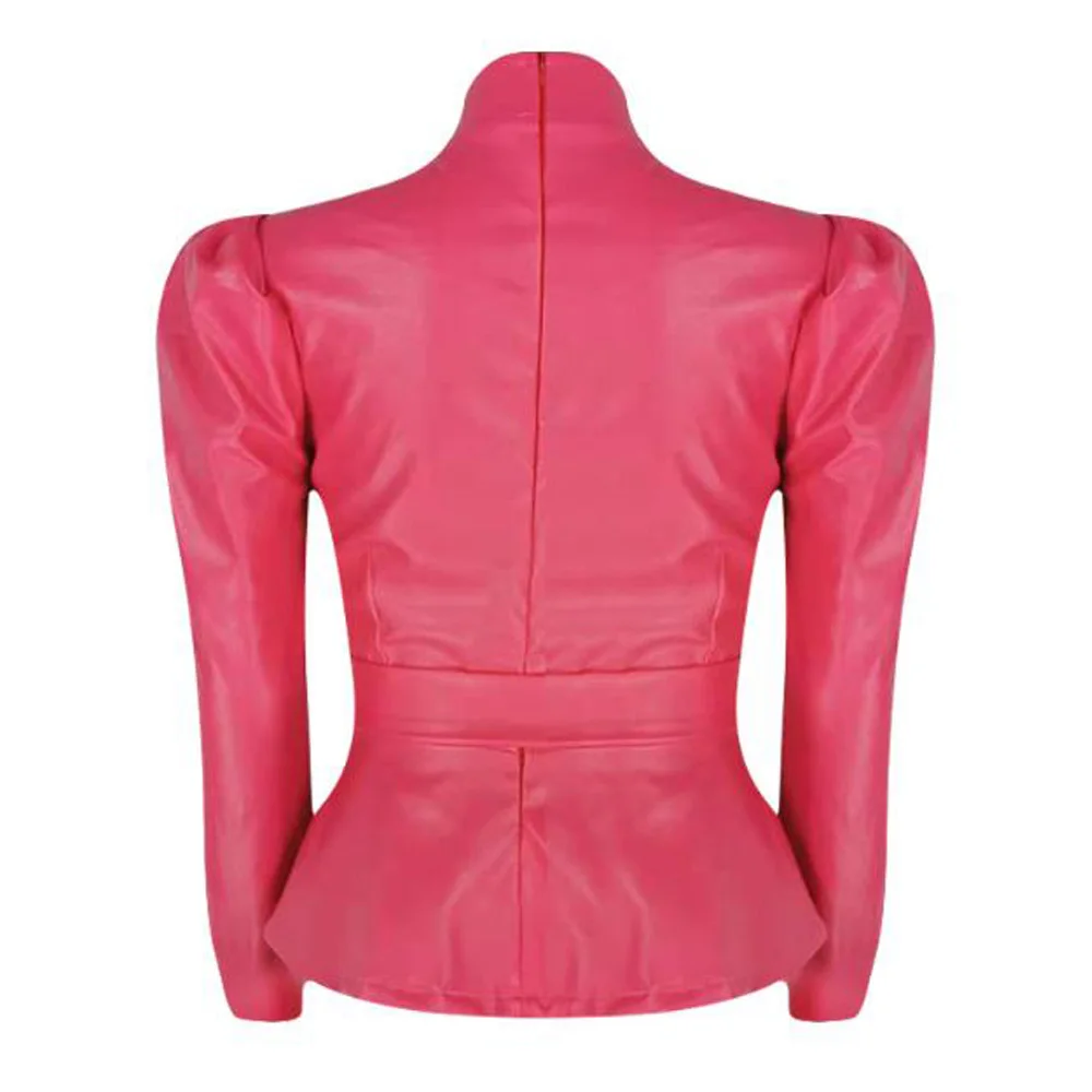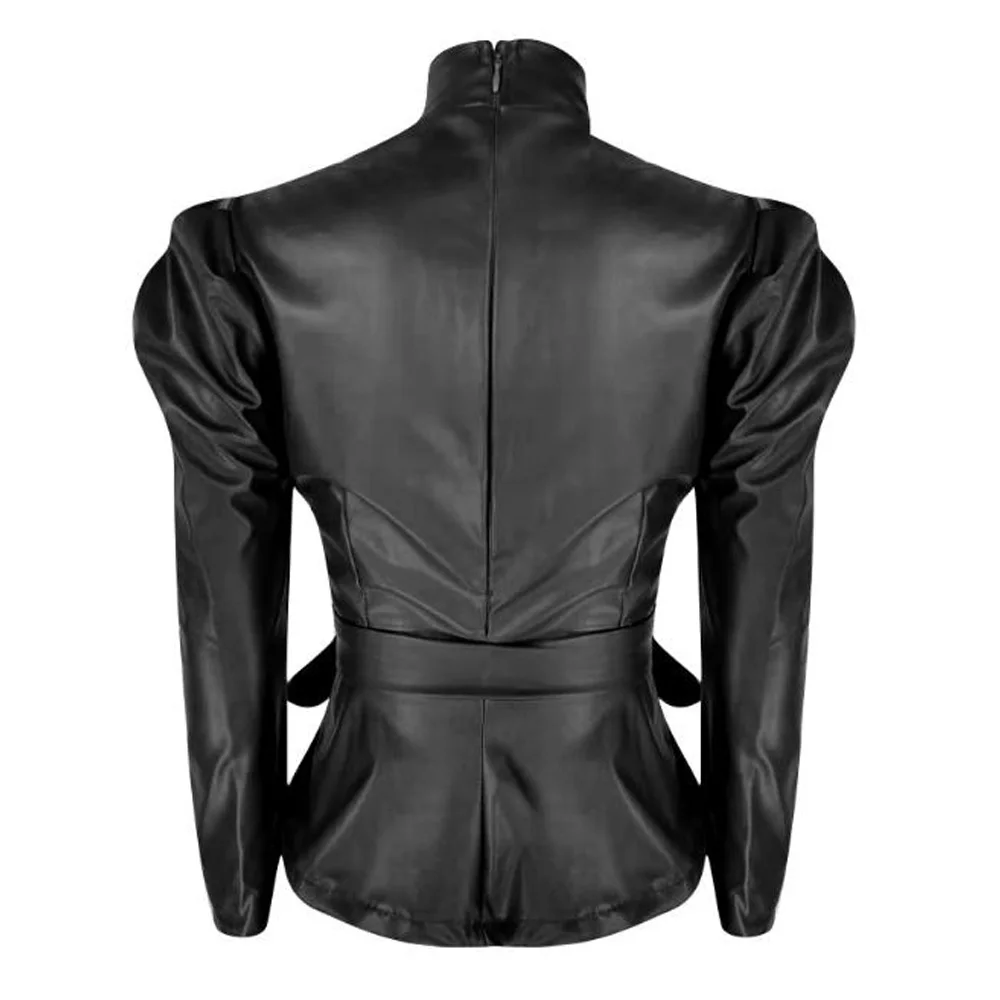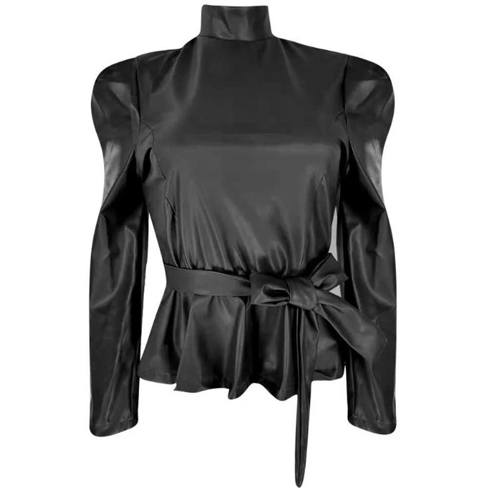 Название: повседневные рубашки из искусственной кожи с длинным рукавом и воротником-стойкой для офисных леди; Модные элегантные топы; Однотонные; Осень 2022 года
