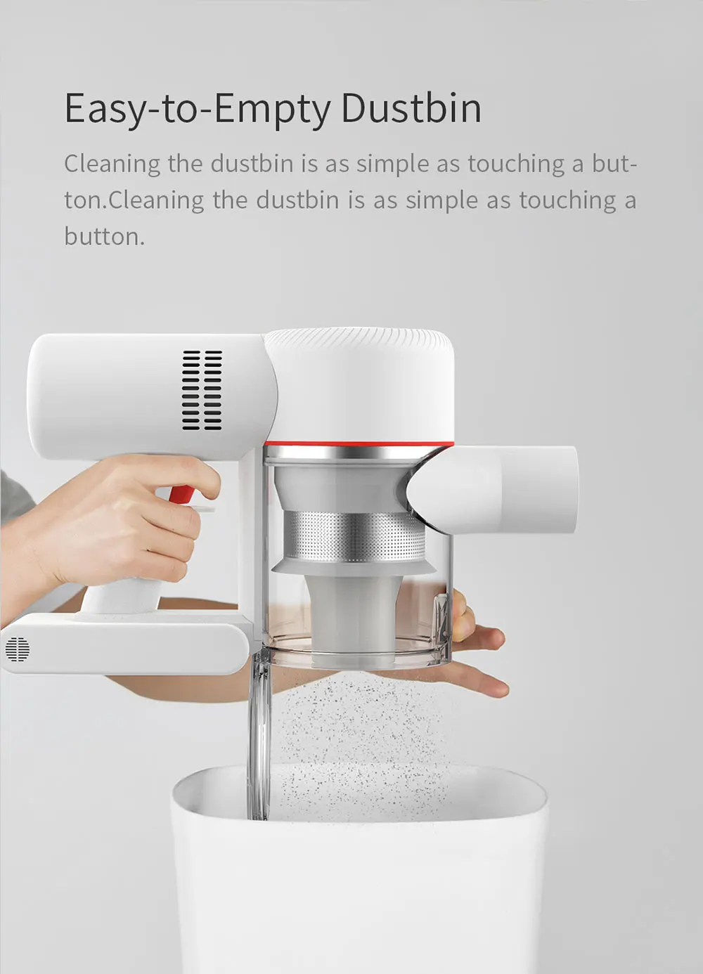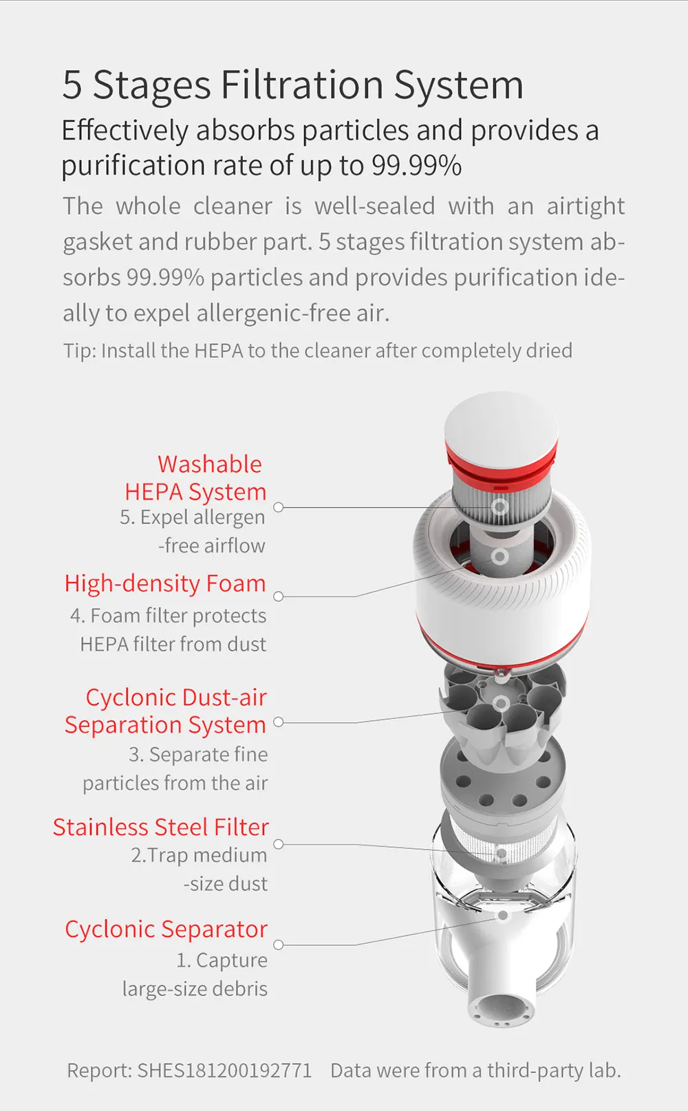Маленькие циклоны создают мощные силы при подаче пыли в мусорное ведро. Пяти этапах фильтрации HEPA фильтр Защита от пыли, как малых по мере того как 0,3 микрона и 99.99% аллергенов. Всасывание в мусорное ведро без попадания в двигатель пылесоса также может избежать вторичного загрязнения во время следующего использования.