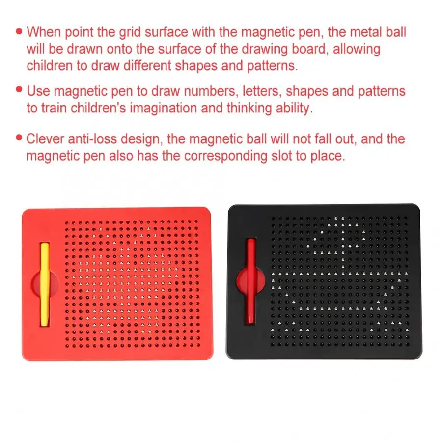 1. When point the grid surface with the magnetic pen, the metal ball will be drawn onto the surface of the drawing board, allowing children to draw different shapes and patterns.