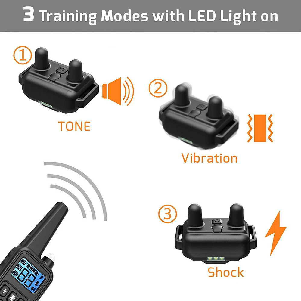 -3 режима обучения: шок/вибрация/звук-с синим экраном подсветки: можно использовать в ночное время-дистанционное управление на дальние расстояния: дистанционное расстояние составляет 800 м (без каких-либо помех)