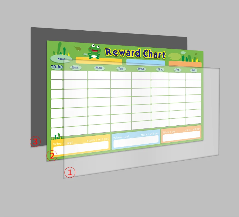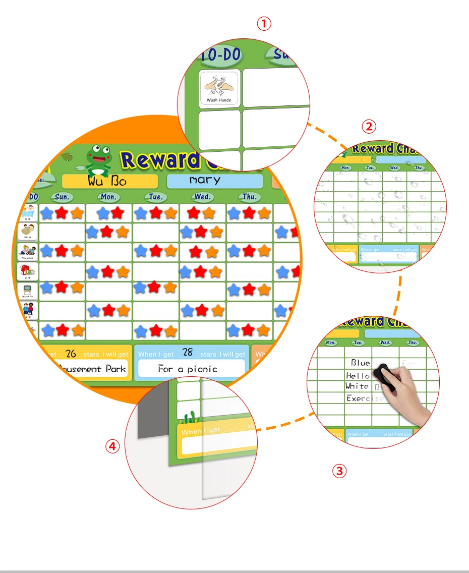 Описание: детские chore chart, магнитное расписание, список дел, планировщик, таблица наград Материал: железный порошок, резина, hd печать, клей, ПЭТ пленка. Характеристики: удерживающие магниты, гибкие, поддерживающие написание, портативные, прочные, приклеиваются к стене. Размер: 60*40 см Толщина: 0,5 мм Стираемость: сухая протирать, долговечная яркая и легко очищенная. Применение: Наклейте на стену, дерево и другую цветную поверхность.