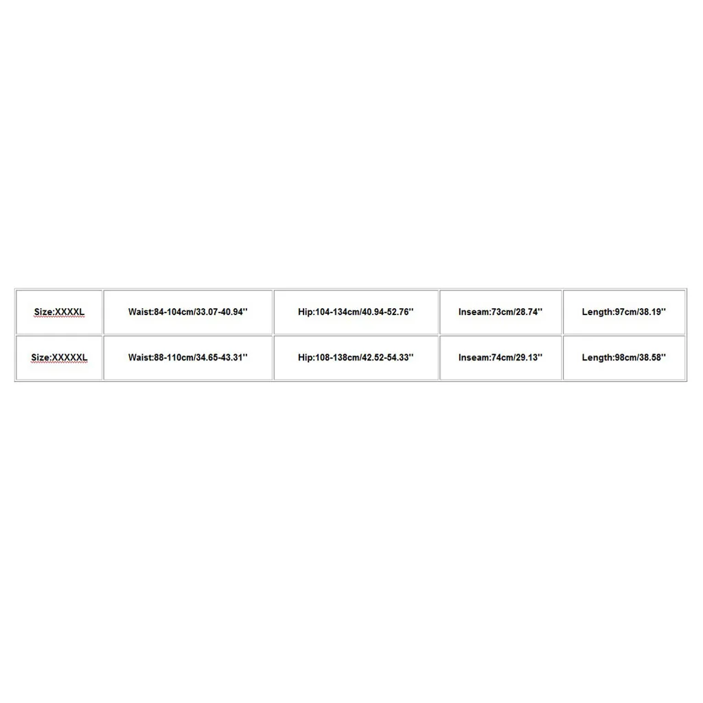 Размер Талия Бедра Внутренний шов Длина XXXXL 84-104 см/33,07-40,94 дюйма 104-134 см/40,94-52,76'' 73 см/28,74'' 97 см/38,19'' XXXXXL 88-110 см/34,65-43,31'' 108-138 см/42,52-54,33'' 74 см/29,13'' 98 см/38,58''