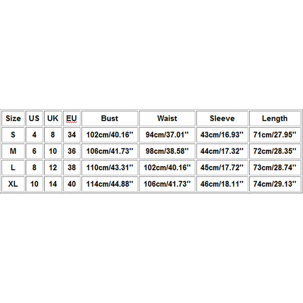 Что вы получаете: 1 x женское платьеРазмер Свяжитесь с нами Великобритания ЕС Обхват груди Обхват талии Рукава Длина S 4 8 34 102 см/40,16'' 94 см/37,01'' 43 см для ухода за ребенком для мам/16,93'' 71 см/27,95'' М 6 10 36 106 см/41,73'' 98 см/38,58'' 44 см/17,32'' 72 см/28,35'' L 8 12 38 110 см/43,31'' 102 см/40,16'' 45 см/17,72'' 73 см/28,74'' XL 10 14 40 114 см/44,88'' 106 см/41,73'' 46 см/18,11'' 74 см/29,13''